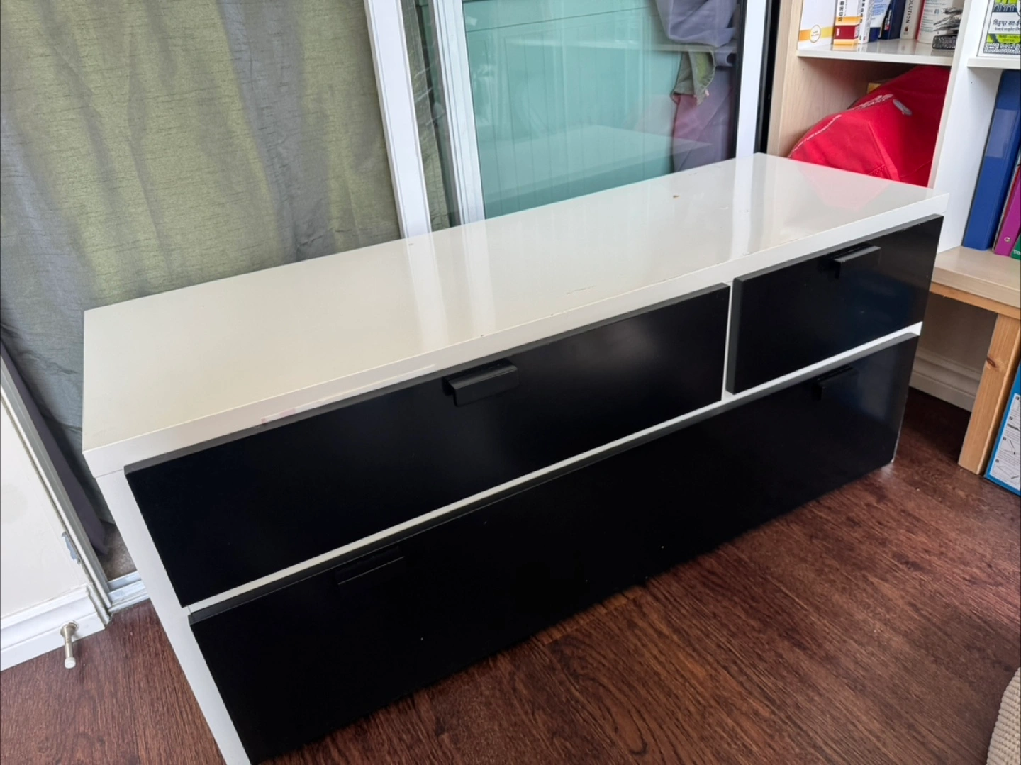 A sturdy storage cabinet. Features two drawers, with black and white finishes. Could be a nice piece of furniture for any space. Some damage to the top (see pictures).