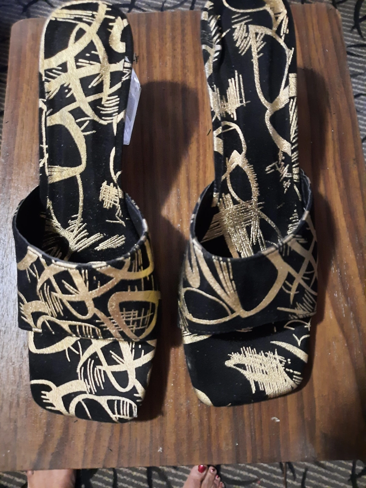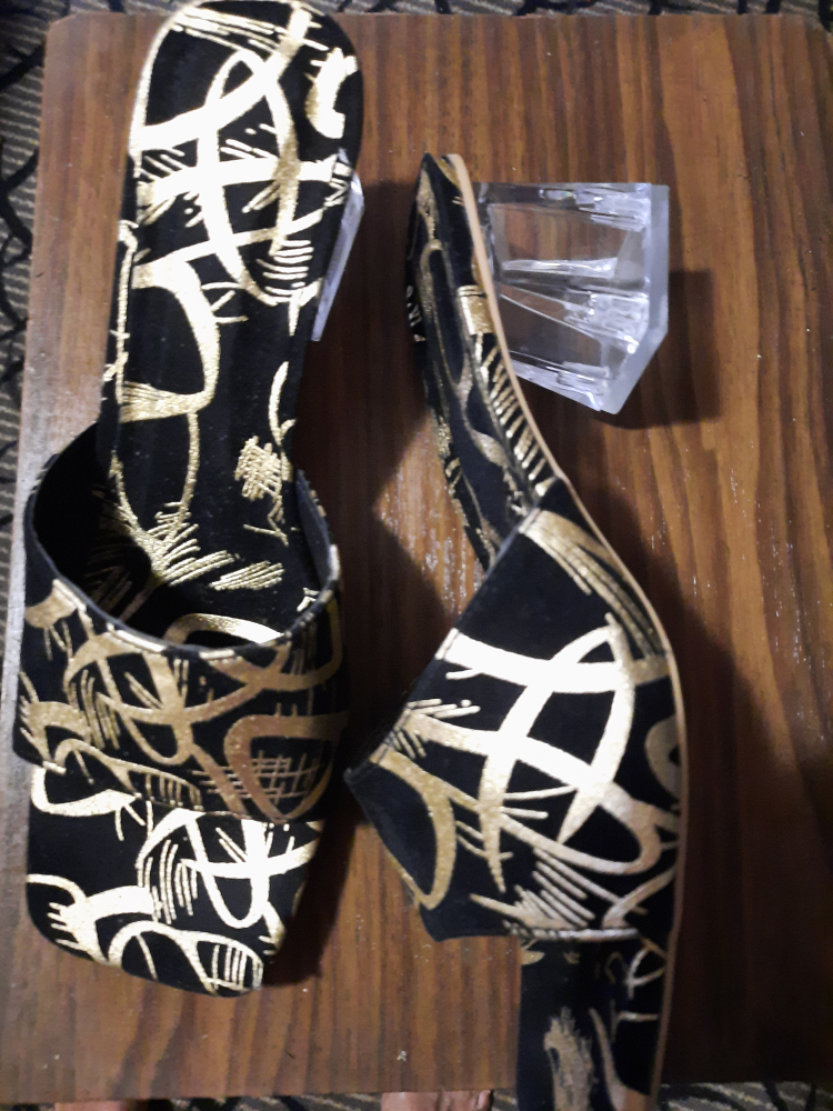 Beautiful heels with a unique design, featuring black fabric with a gold pattern. They have clear heels. These heels would be wonderful for a night out.