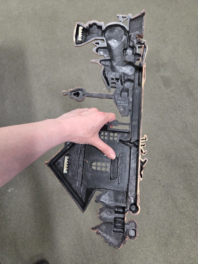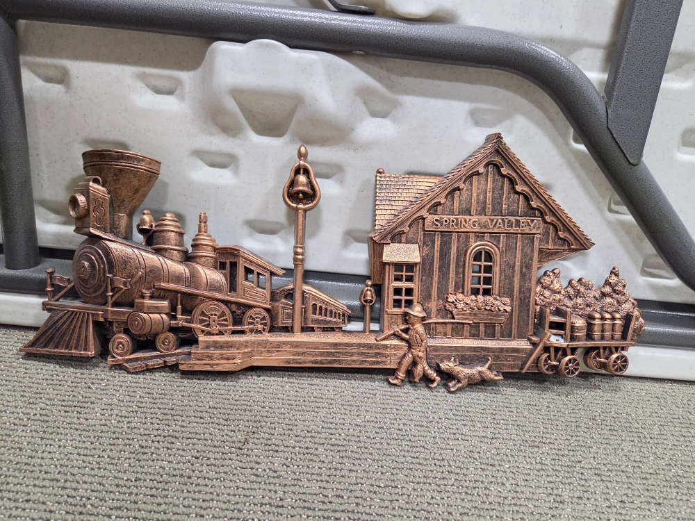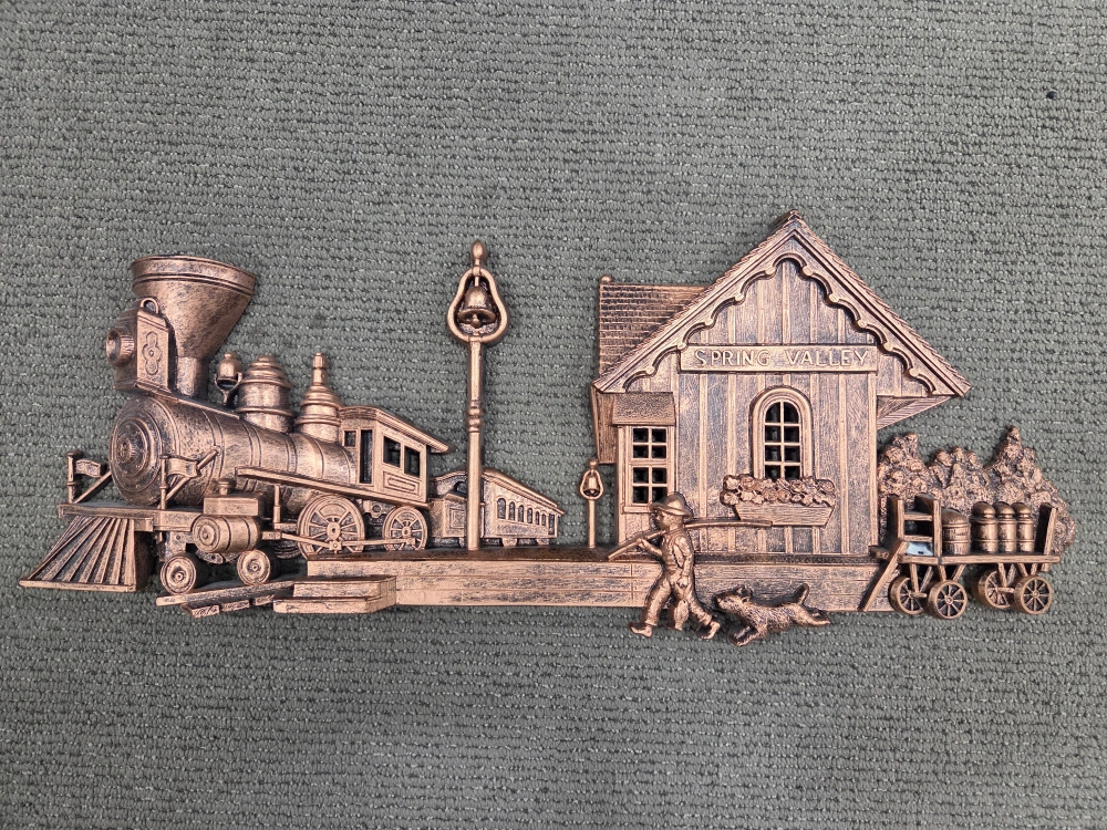 A charming train station wall decor piece in a metallic bronze finish. It features a train, train station, and figures. Display this in your home to bring a touch of history and nostalgia to your walls.