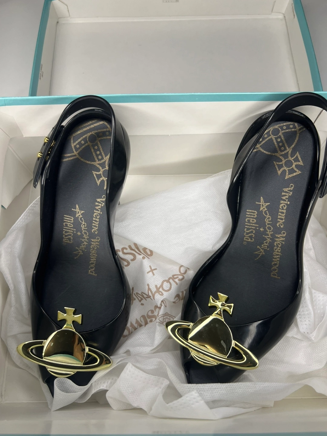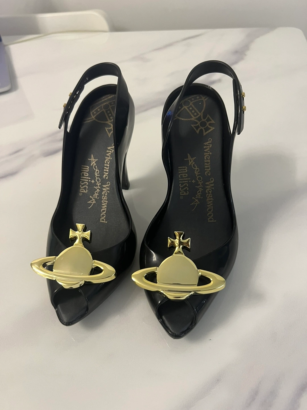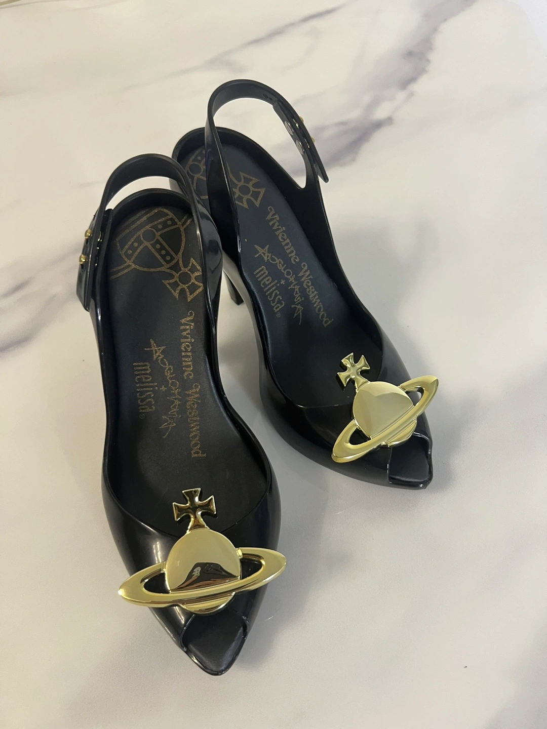 Melissa x VW 31795 Anglomania Rubber Rubber, Leather, Micro, Metal Signature orbit logo Open toe 8.75” length 3.25” across the forefoot 3.” heel height 35/36, fits like 35.5 Rare collab Bought from Originals on Queen west Mint condition 99%, Only tried on indoor. With original dust bags and box Authentic DM for any questions