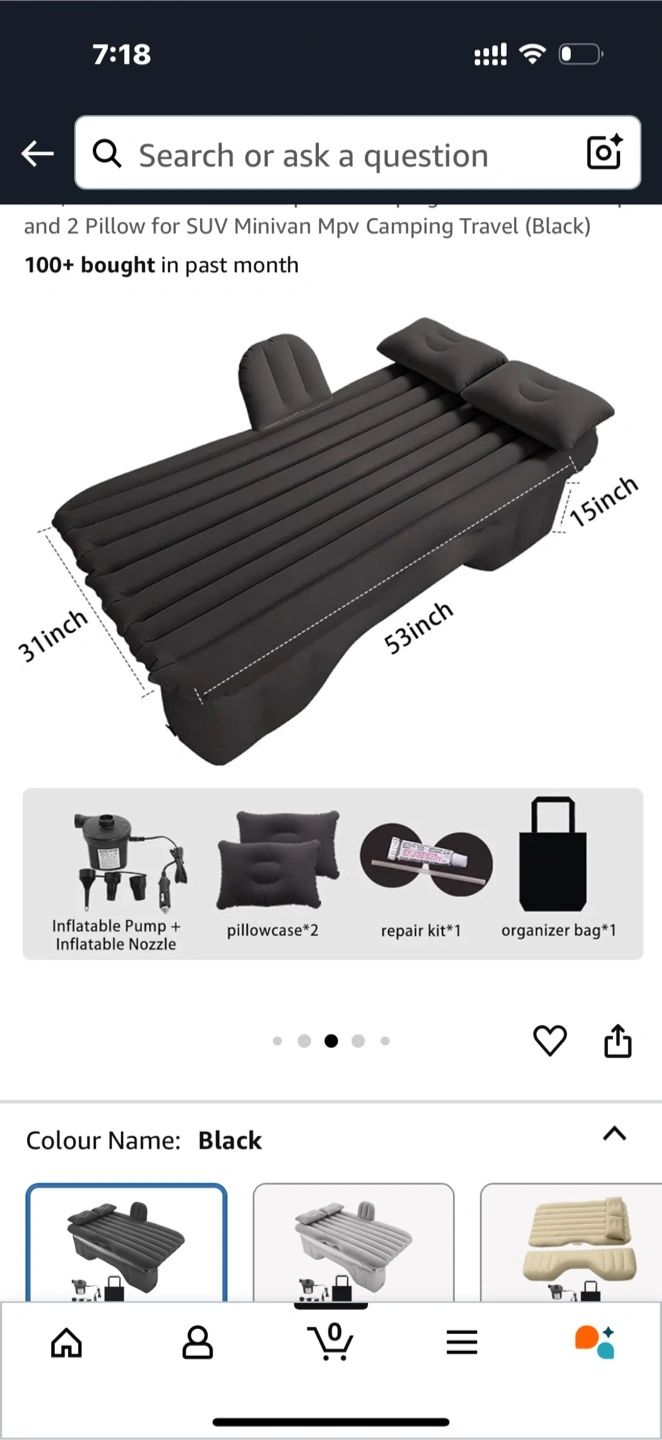 Black inflatable car bed. Two small pillows are included. Comes with an inflatable pump. A wonderful addition to your car for those times you want to take a break and relax.