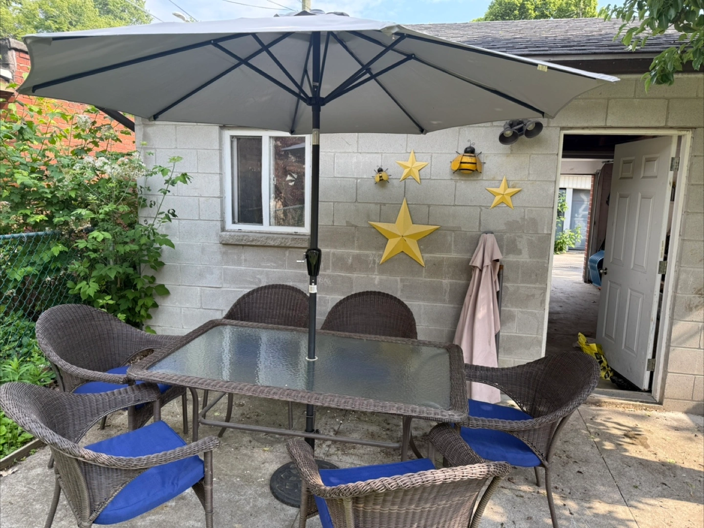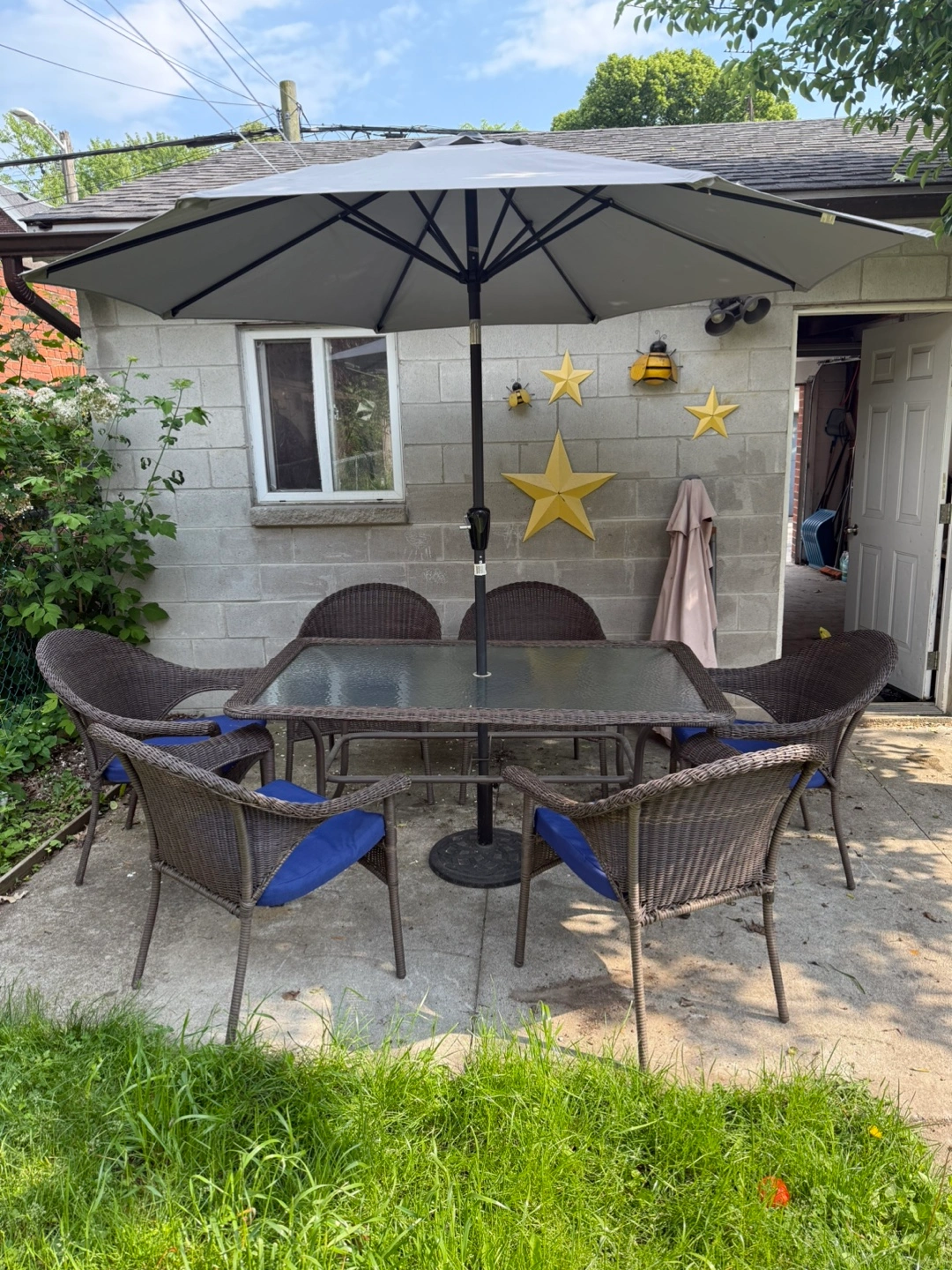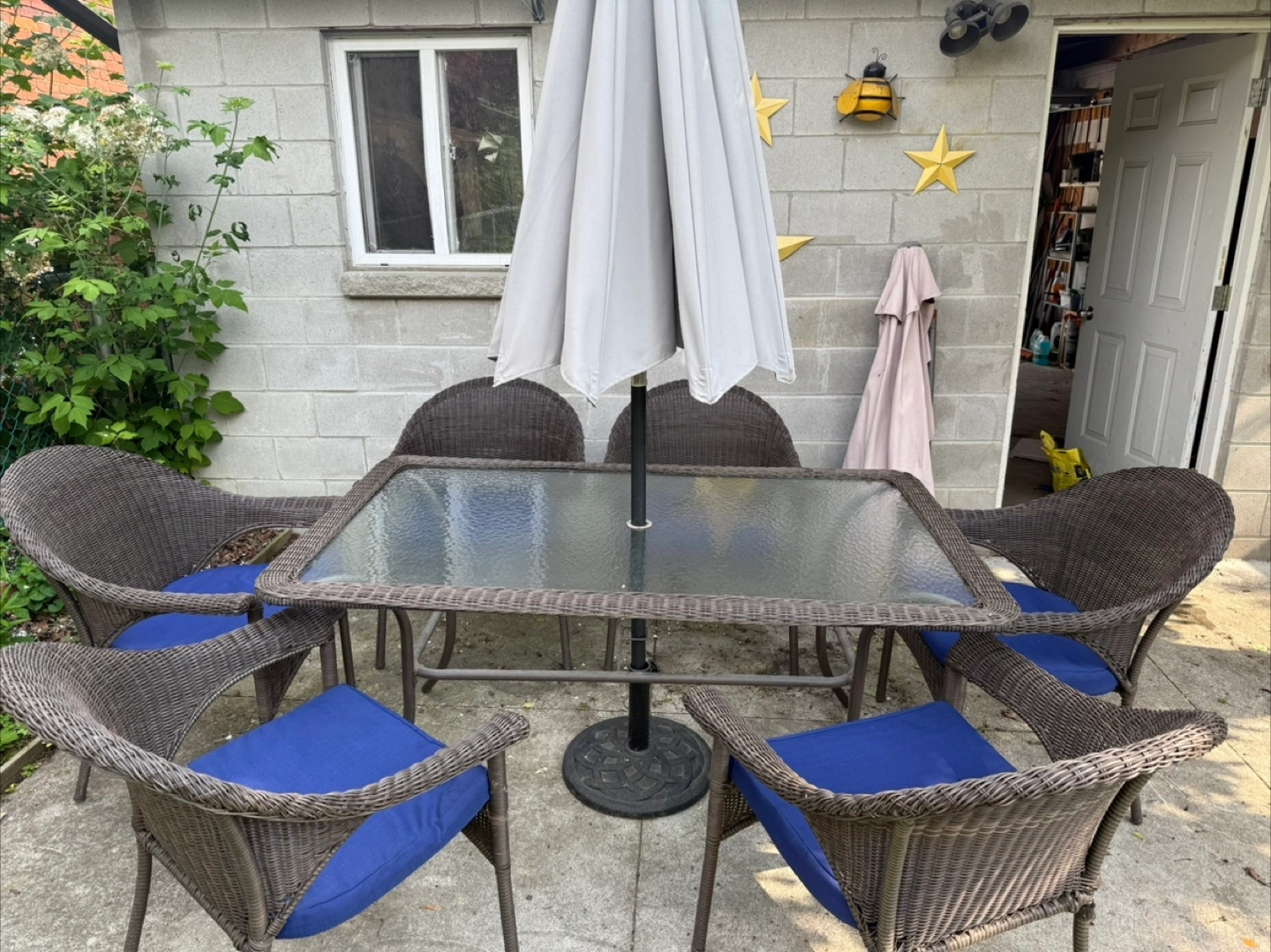 The set includes a table, 6 chairs, the blue cushions shown, a half umbrella and the heavy duty umbrella stand. The chairs are wicker style, with blue cushions.