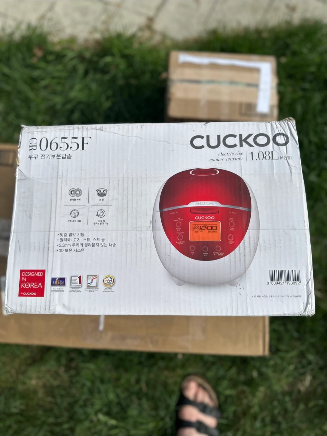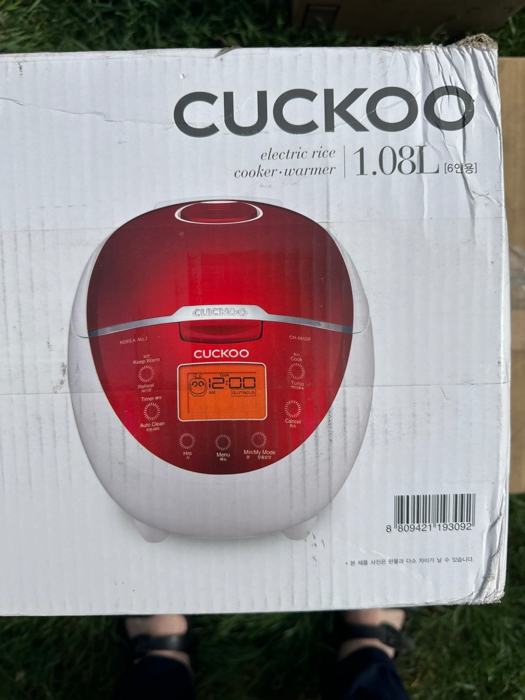 This is a rice cooker and warmer in its original packaging. The front has a digital display, as well as several buttons. The exterior is white with a red top. Preparing meals can be relaxing with the help of this appliance.