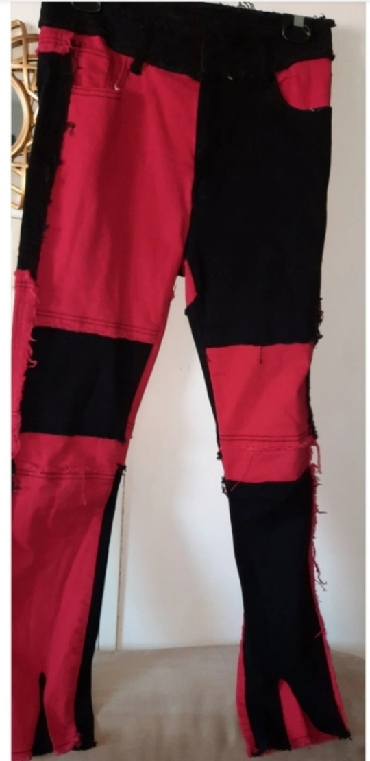 Patchwork jeans in red and black colours. Features frayed edges. The pants have two back pockets and front pockets. These jeans are a great addition to any wardrobe, no matter the style you are going for.