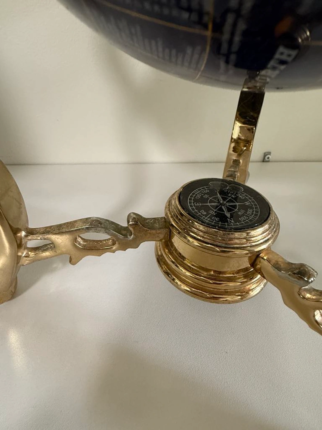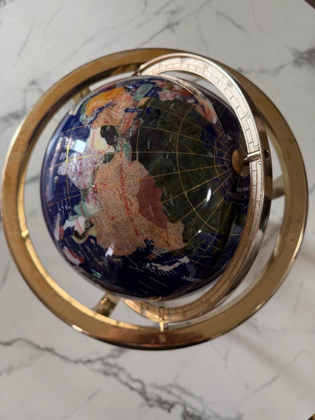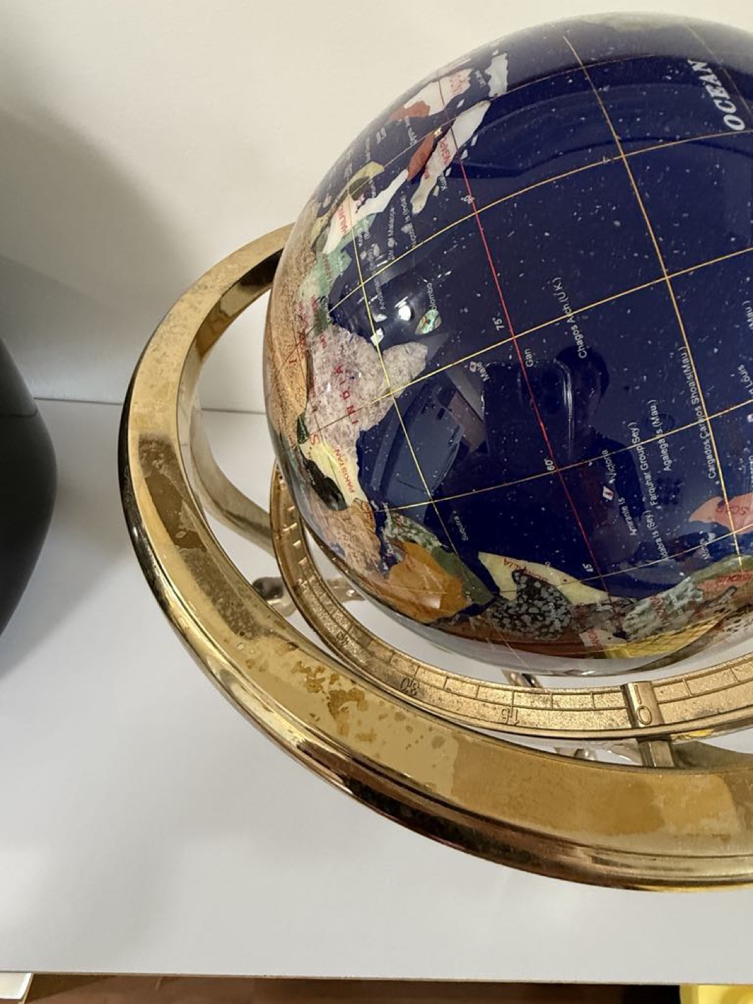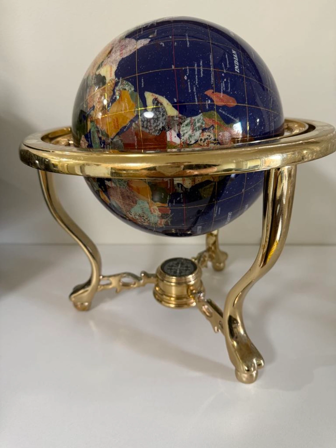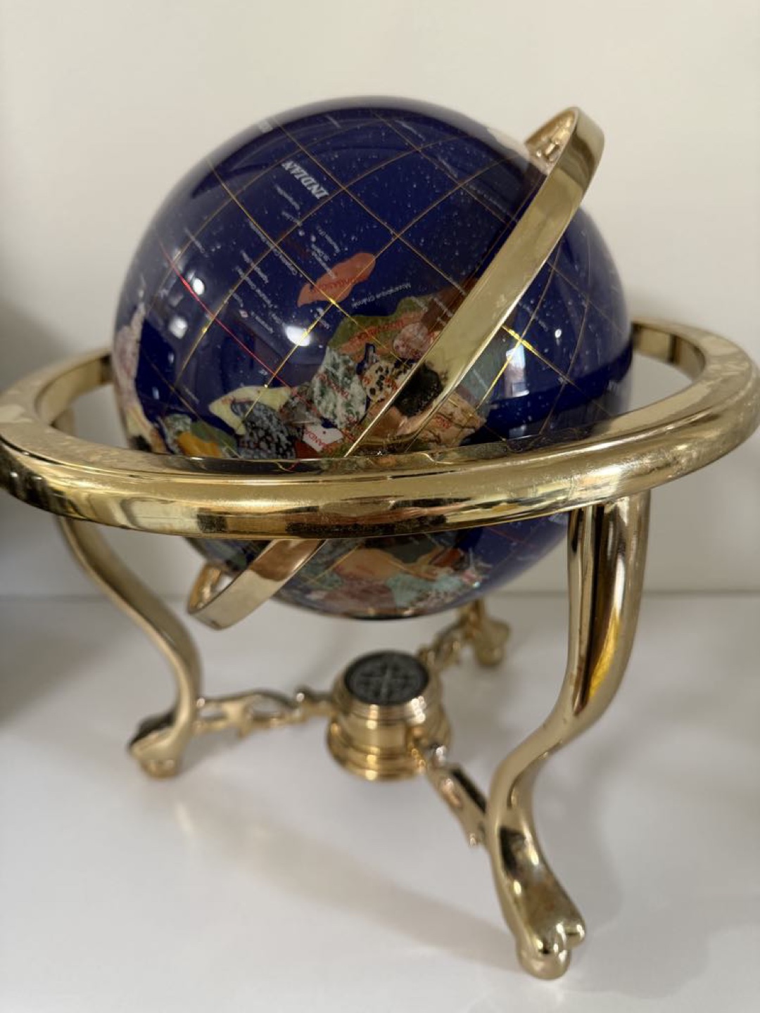 Beautiful, gemstone globe, with blue background and gold accents. The globe sits in a gold brass stand, with compass feature. This globe would look wonderful displayed on a desk for a relaxing aesthetic.