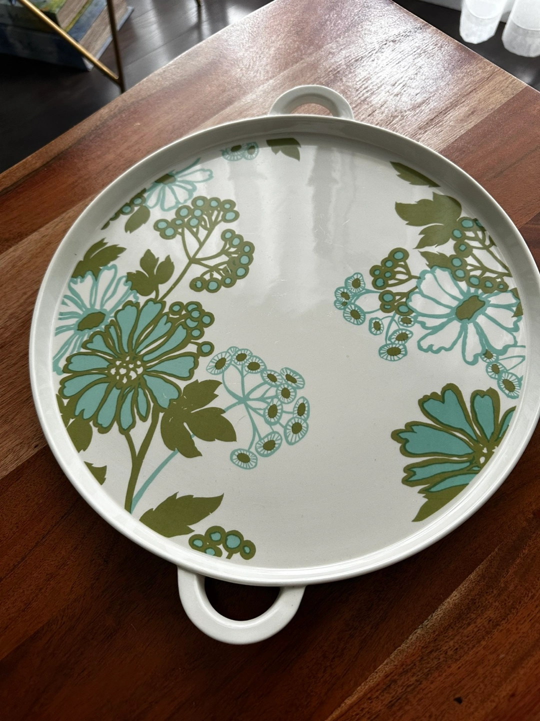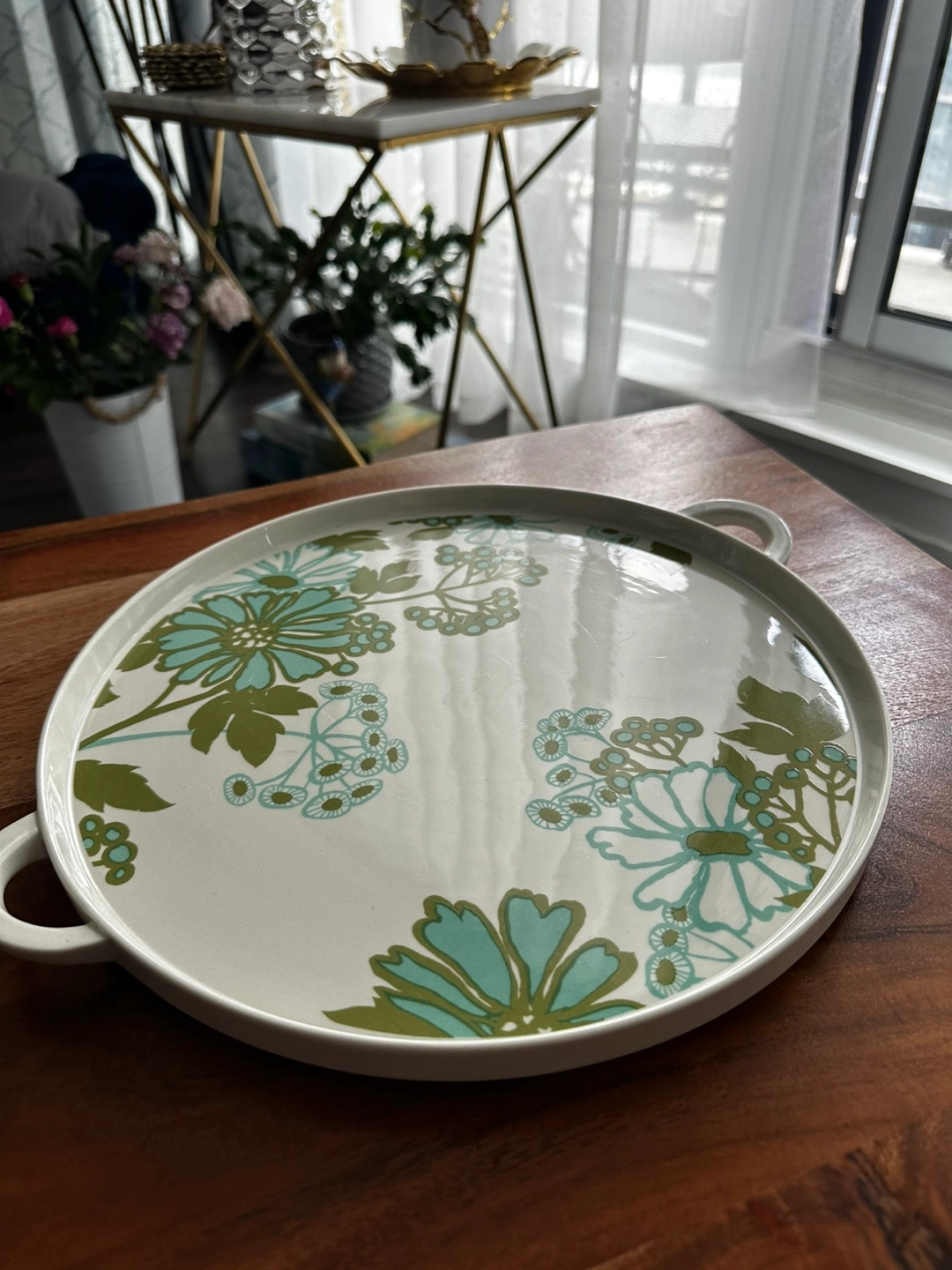 A lovely round serving tray. Features floral design in shades of green and blue. Comes with two handles. Displaying this tray will add charm to any room and create a sense of peace.