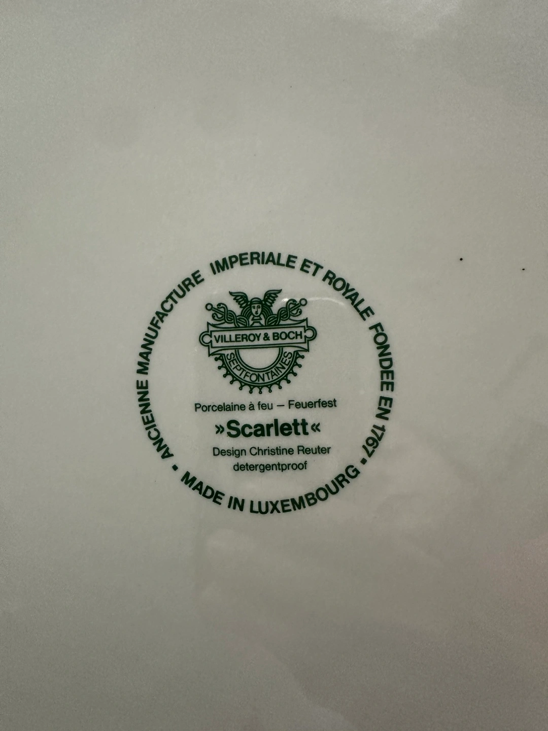 Some not noticeable scratches, but other then that beautiful piece! Large plater.