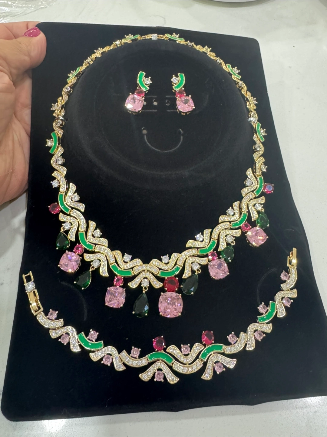 Offering this lovely jewel set. Comes with a necklace, a bracelet, and earrings. The gold-toned metal has some colourful stones and green accents. This set would be a great accessory for a special occasion.