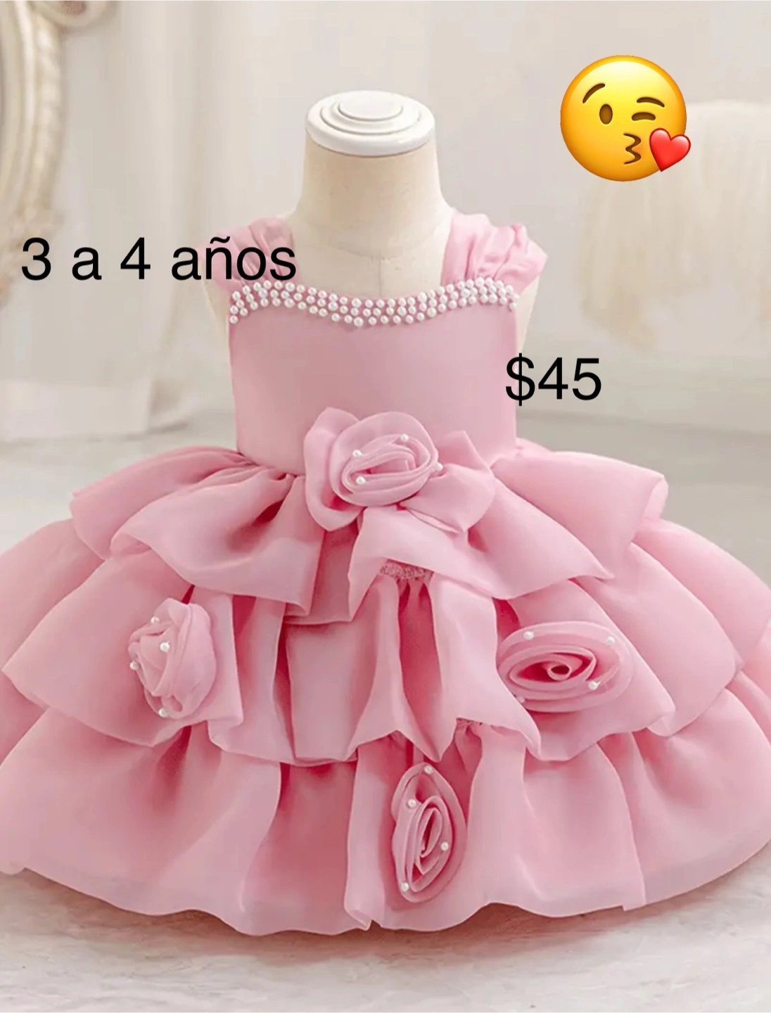 A lovely pink dress. Features layers of ruffles. A zipper closure in the back. Adorned with rosettes. This would be perfect for a special occasion where you want to feel elegant.