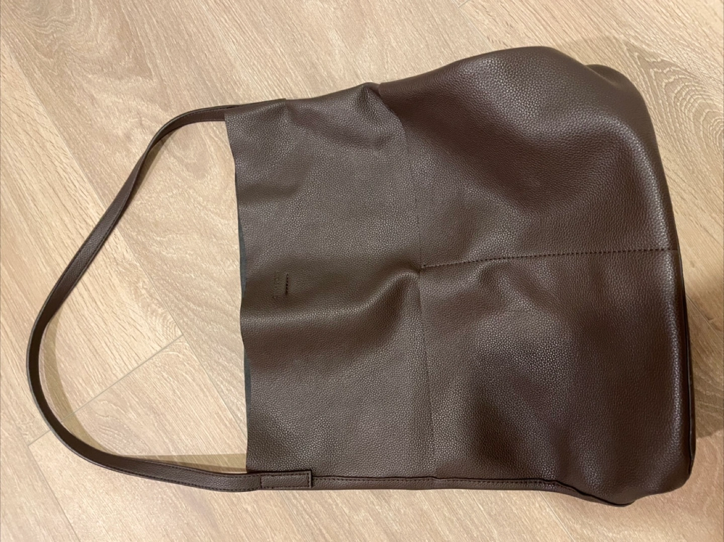 A lovely brown shoulder bag. Made of a leather-like material. It has a long strap, which makes it easy to carry. A great bag to add to your collection, so you can put your mind at ease.