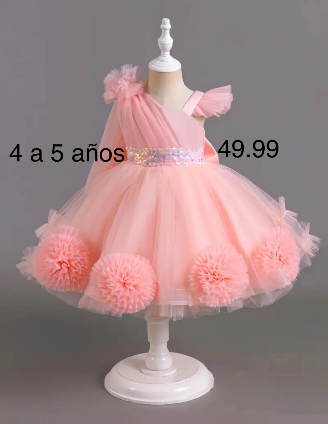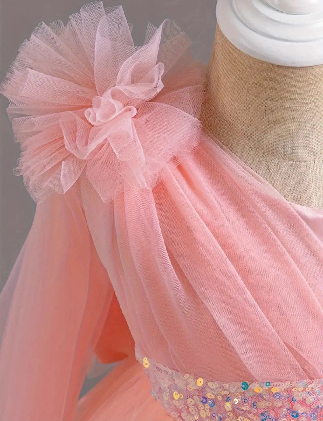 Beautiful pink dress. Made of tulle. One long sleeve, the other sleeve is a frilly shoulder. The back has a bow. A perfect dress to wear to a special event.