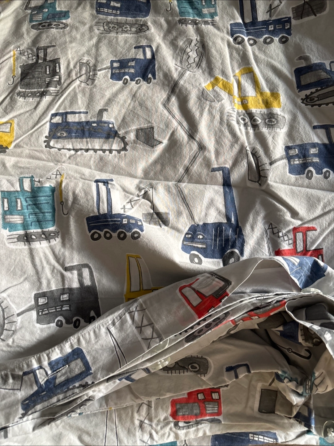 Features a delightful pattern of construction vehicles. Made of organic cotton. A perfect addition to a child's bedroom for a peaceful sleep.