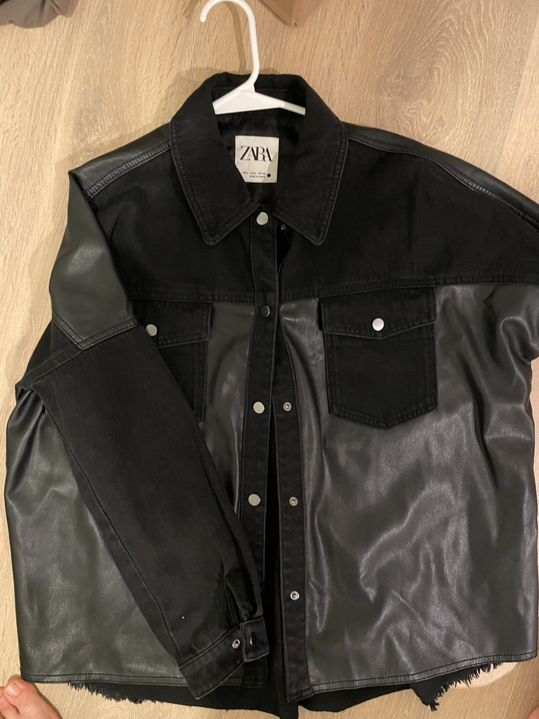 A black jacket. Has a button-up closure. Made with a combination of fabrics. You will find this jacket a versatile piece for your wardrobe.