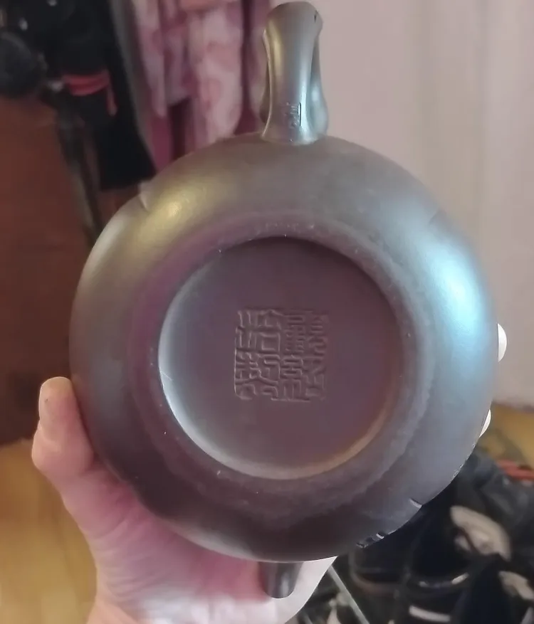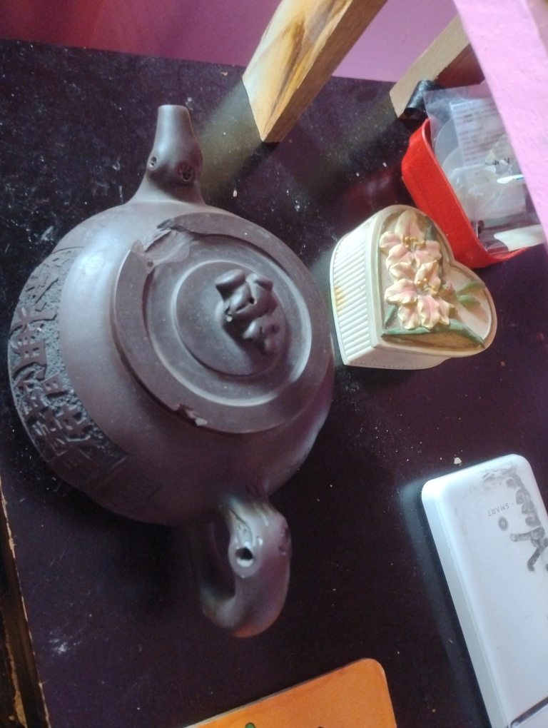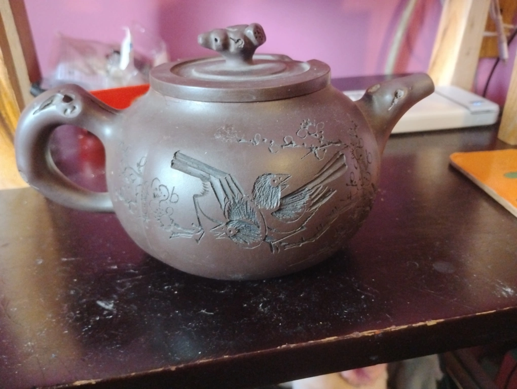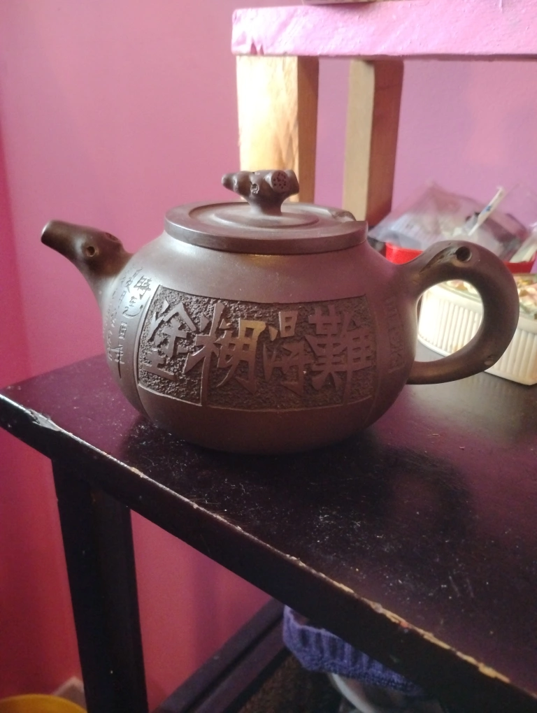 Beautiful brown ceramic teapot. Lid present. Handle is shaped nicely. One side of the teapot contains carved imagery. Enjoying tea from this will bring a sense of relaxation.