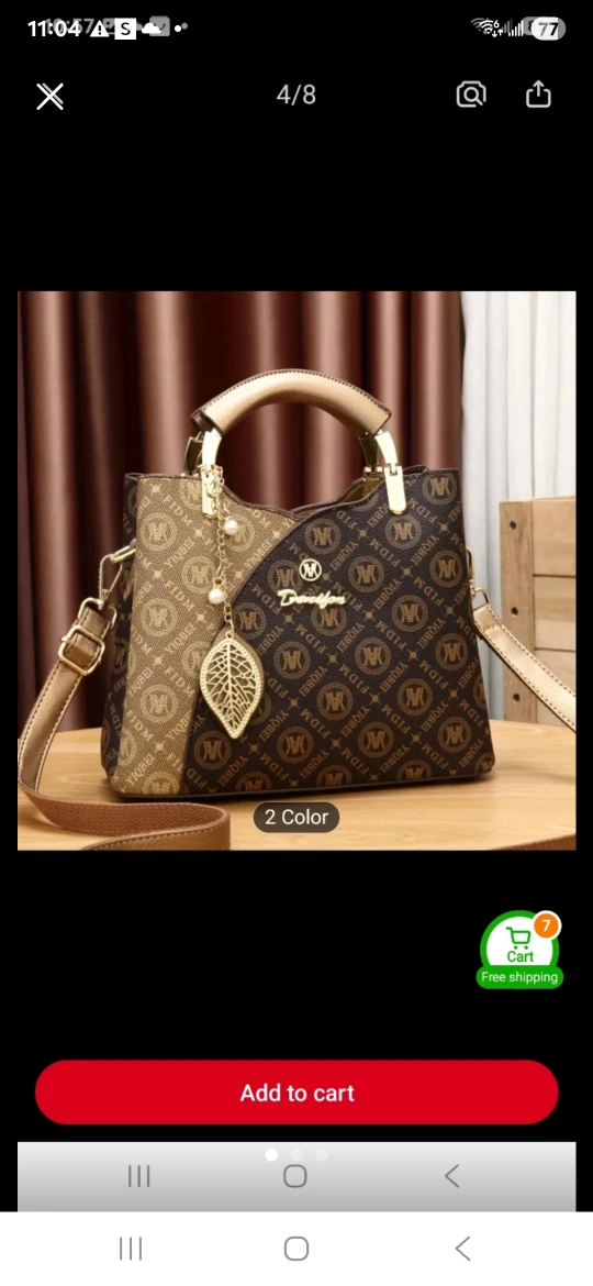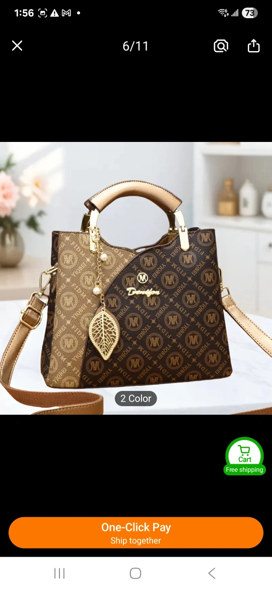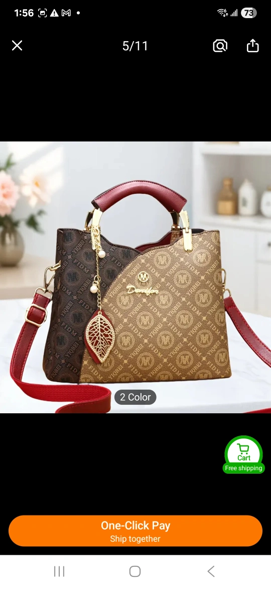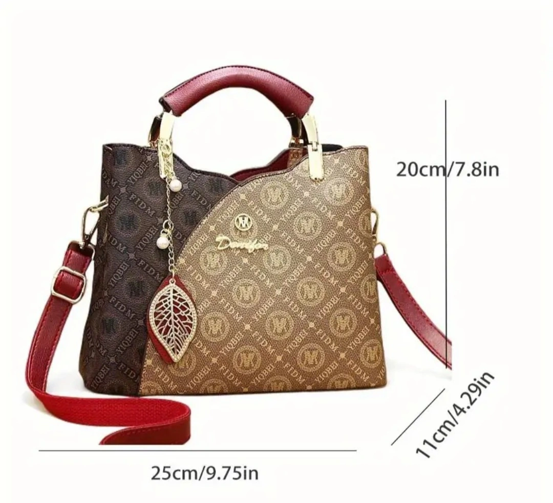 A fashionable handbag. Features a dual-tone design. Comes with a gold handle, a shoulder strap, and a decorative leaf charm. Consider carrying this bag to your next outing, it will make you feel beautiful.
