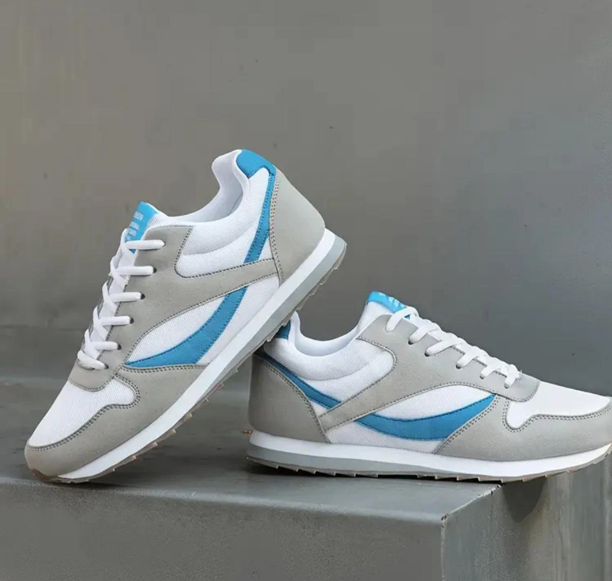 Sneakers with white laces. Grey and white uppers. Features blue accents. A peaceful walk in these sneakers would do you well. size 9.5