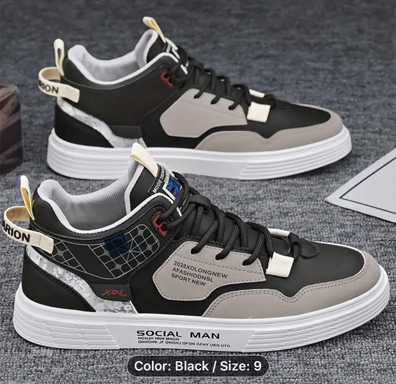 These stylish sneakers feature a modern design. They showcase a black and grey colour scheme. The sneakers include white accents and a white sole. Take a moment to put these shoes on and relax.