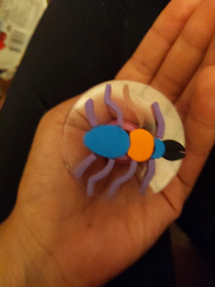 A cute bug Features a light purple and blue body with an orange segment. Includes a round, transparent base.