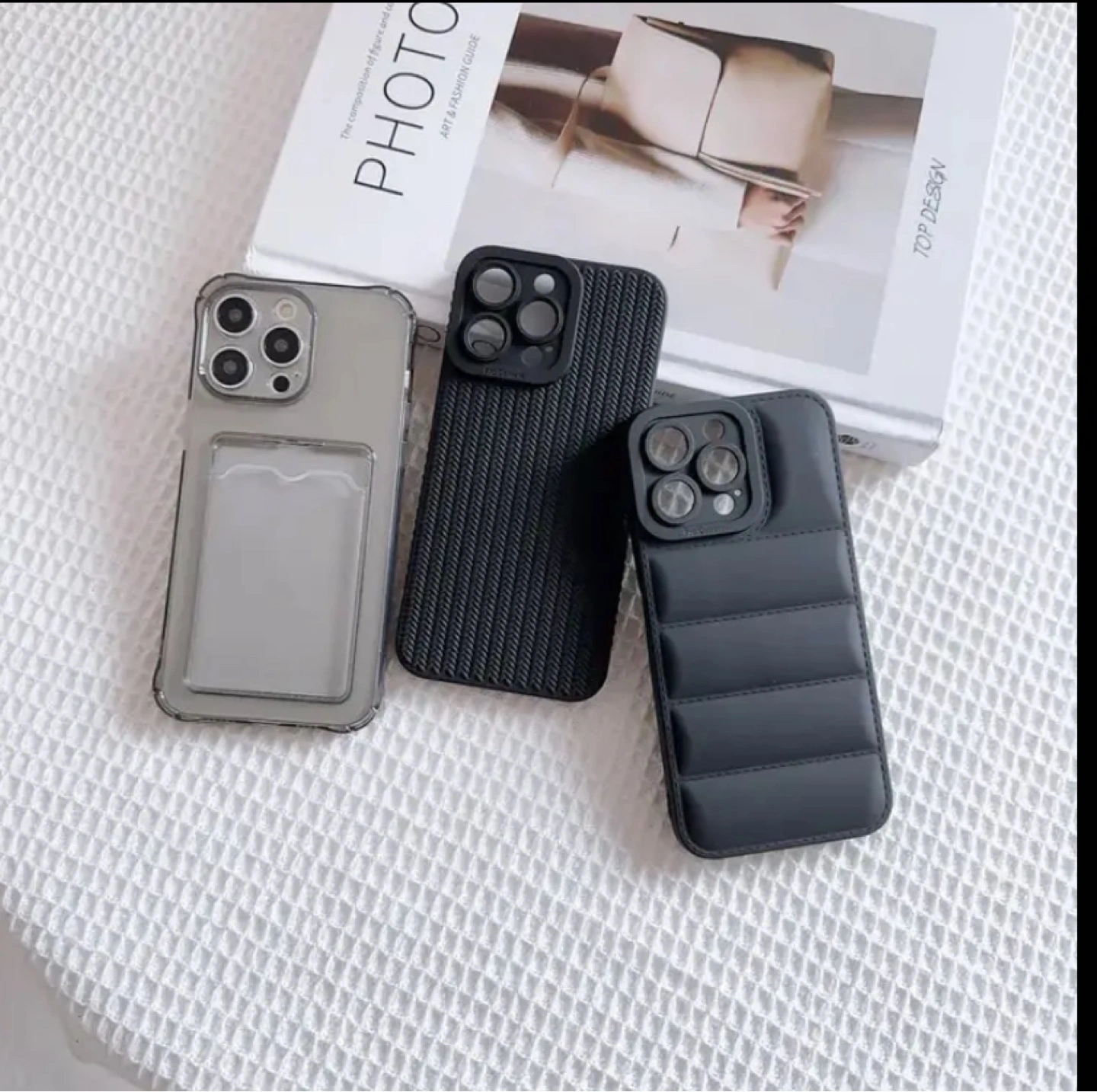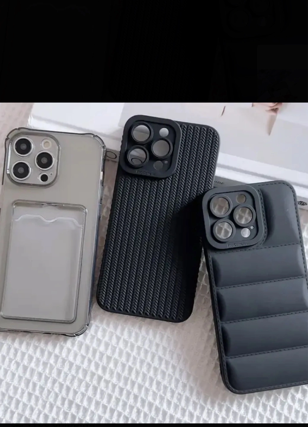 Offering three different cases, offering great protection. One clear case with a cardholder. Another with a lined pattern. The last case with a quilted pattern. They are a wonderful addition to your device.