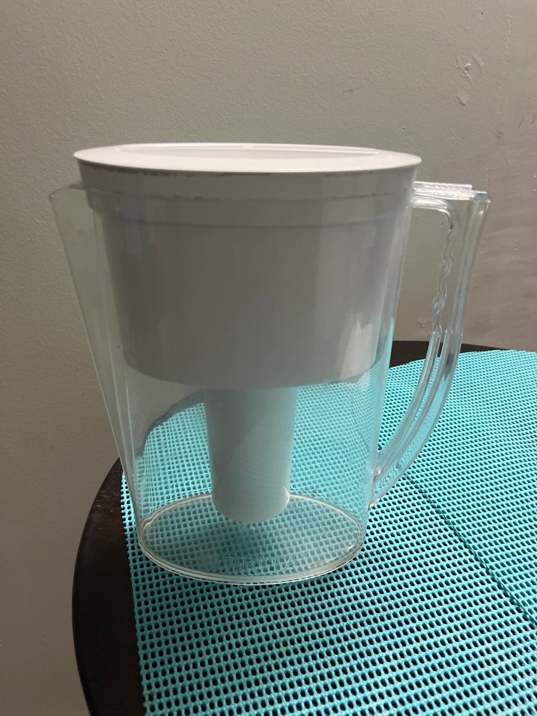 A water filter pitcher. Features a white reservoir and lid. Clear plastic body with a handle. This pitcher will help you stay hydrated and refreshed, bringing you a sense of peace.