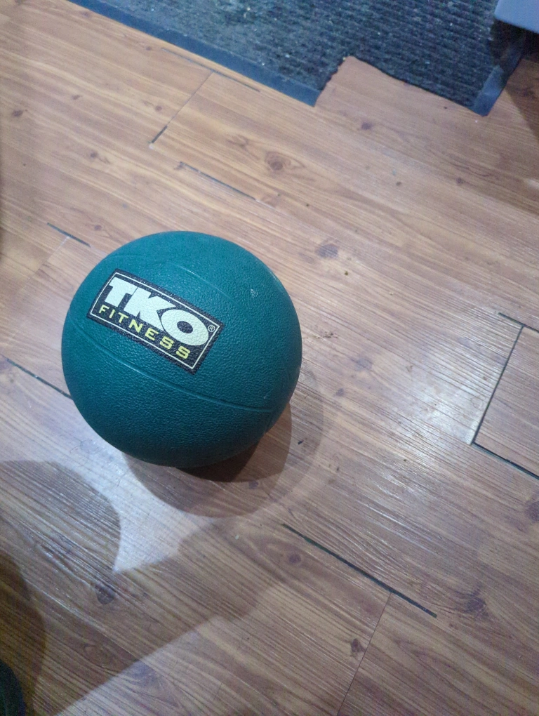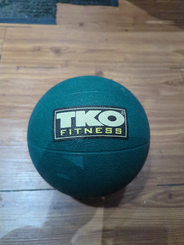 Green medicine ball. Has a textured surface. Marked with the weight, 4 lbs. A perfect addition to your home workout routine, a weighted ball can help build strength and improve coordination.