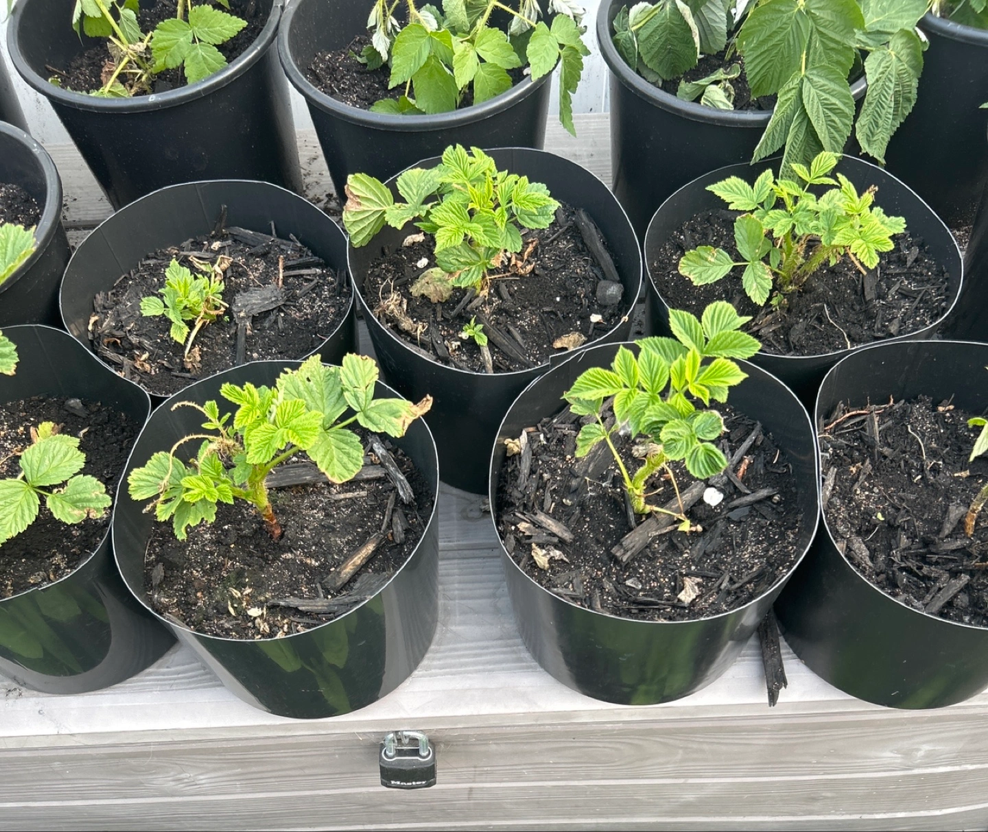 Offering a grouping of potted plant starts. The plants are in black pots. Fresh green leaves are seen emerging from the soil. Buy 2 get one free. Would also consider trading for strawberry plants.