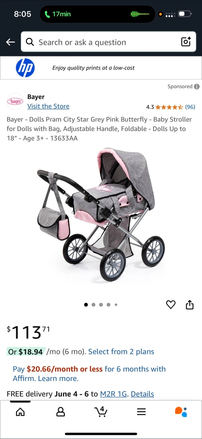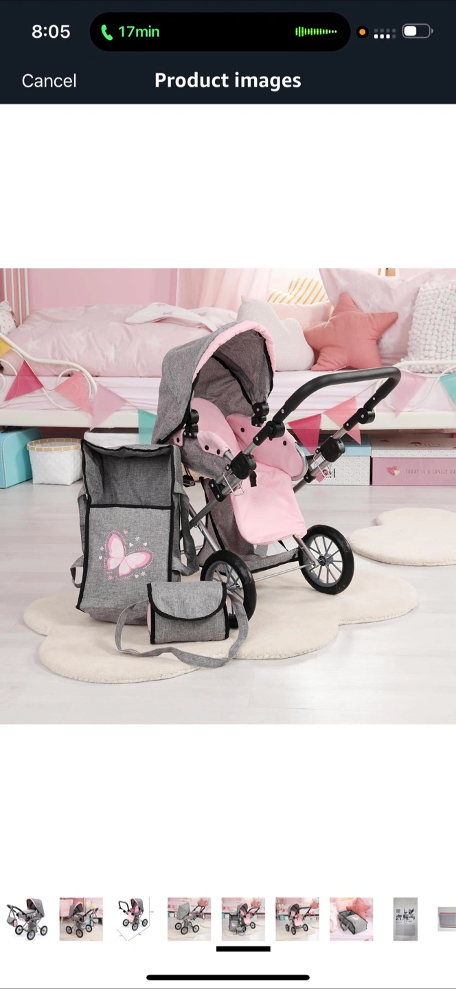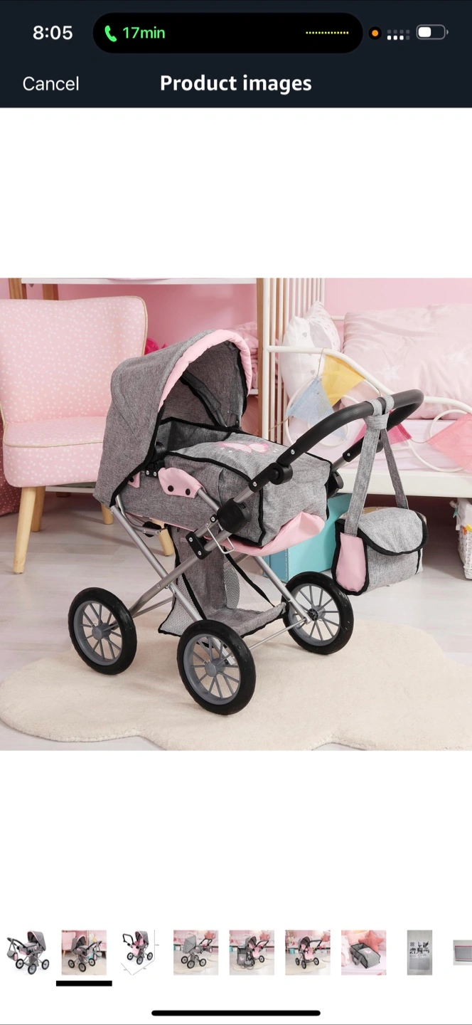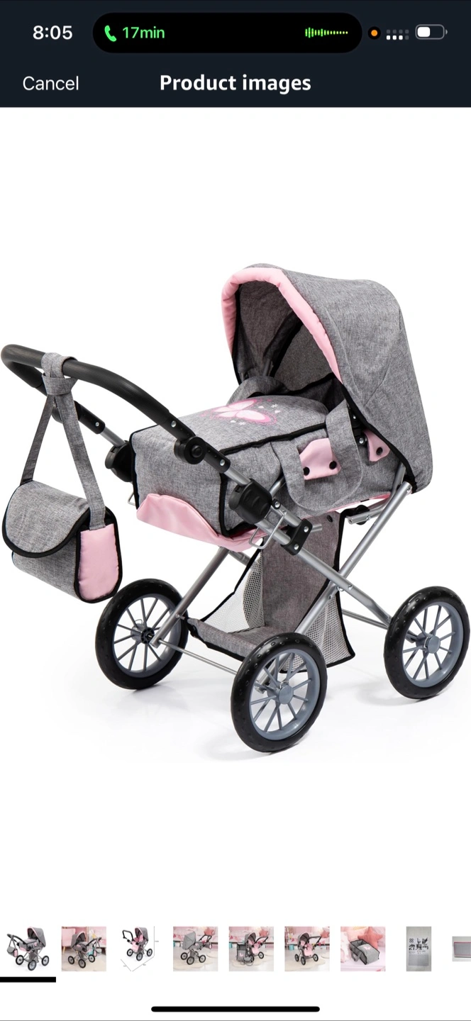 The stroller is grey and pink in colour, with a silver metal frame. It appears to have a handle, a storage bag, and a canopy. This stroller would be great for imaginative play.
