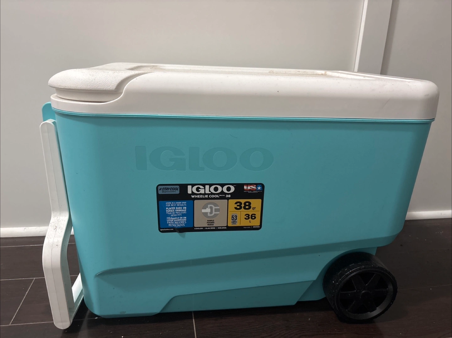 Hardly used a sturdy cooler with wheels. The cooler is a cheerful teal colour and has a white lid. Handle folds down for easy transport. Take it with you to your next picnic for a refreshing day.