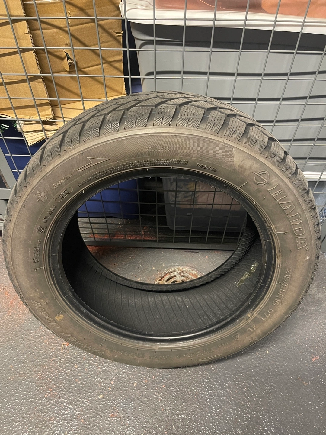 Tire shows signs of previous use. Features a winter tread pattern. A great tool for ensuring you're safe on the road in winter conditions.