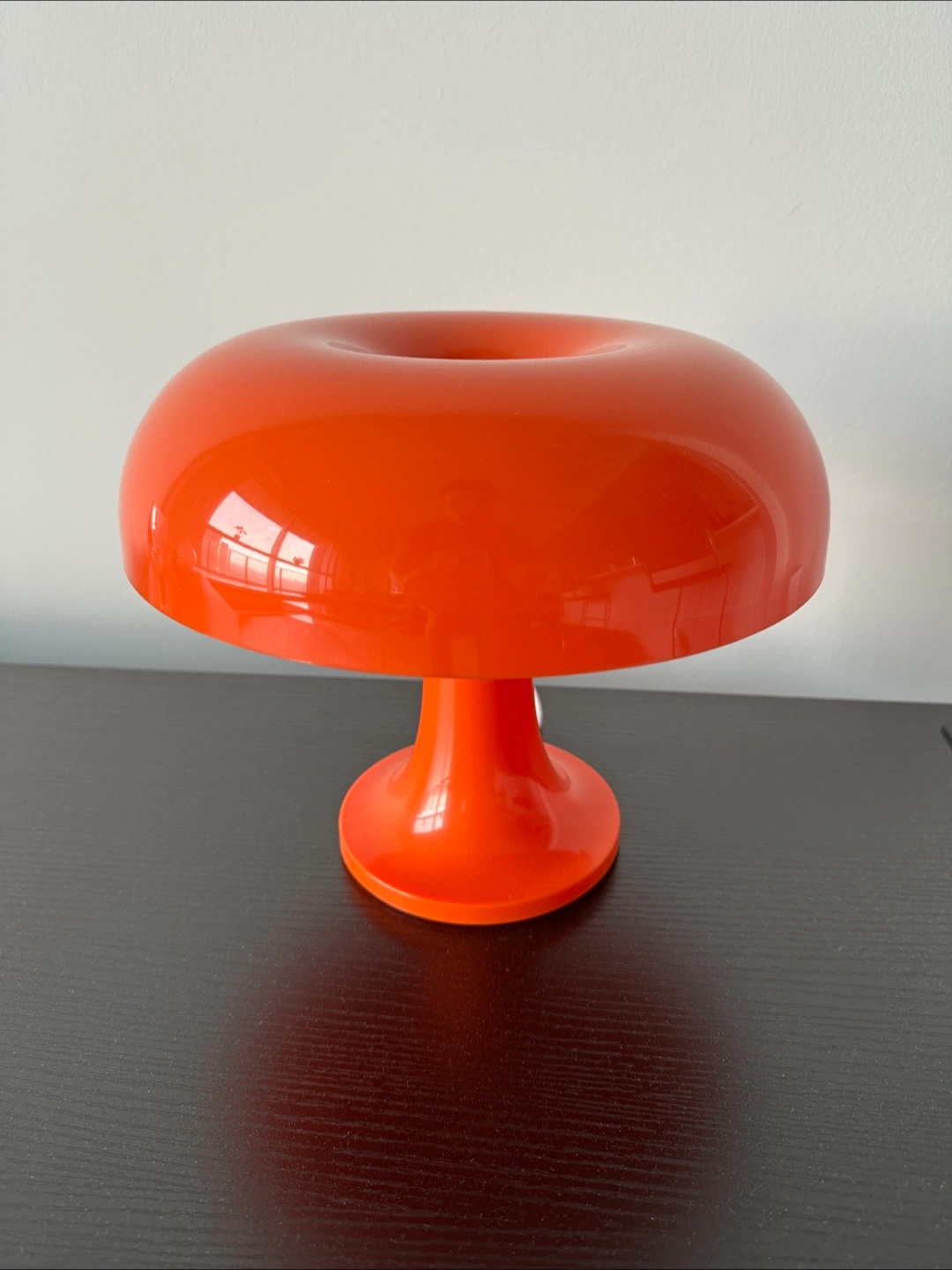 The lamp features a vibrant orange colour. The lamp's shape is circular and mushroom-like. It has a wide base and a dome-shaped shade. Perfect for adding a touch of warmth to any space. Written with AI.