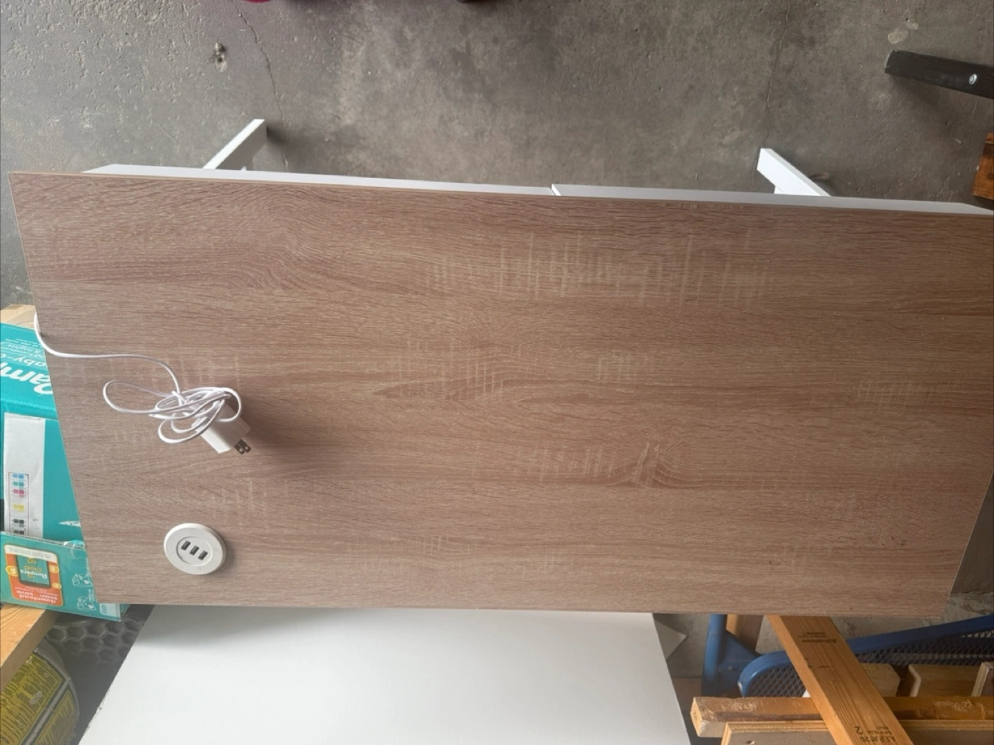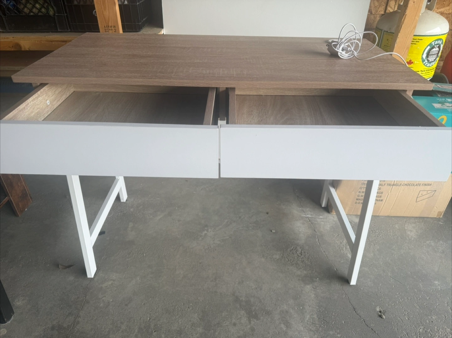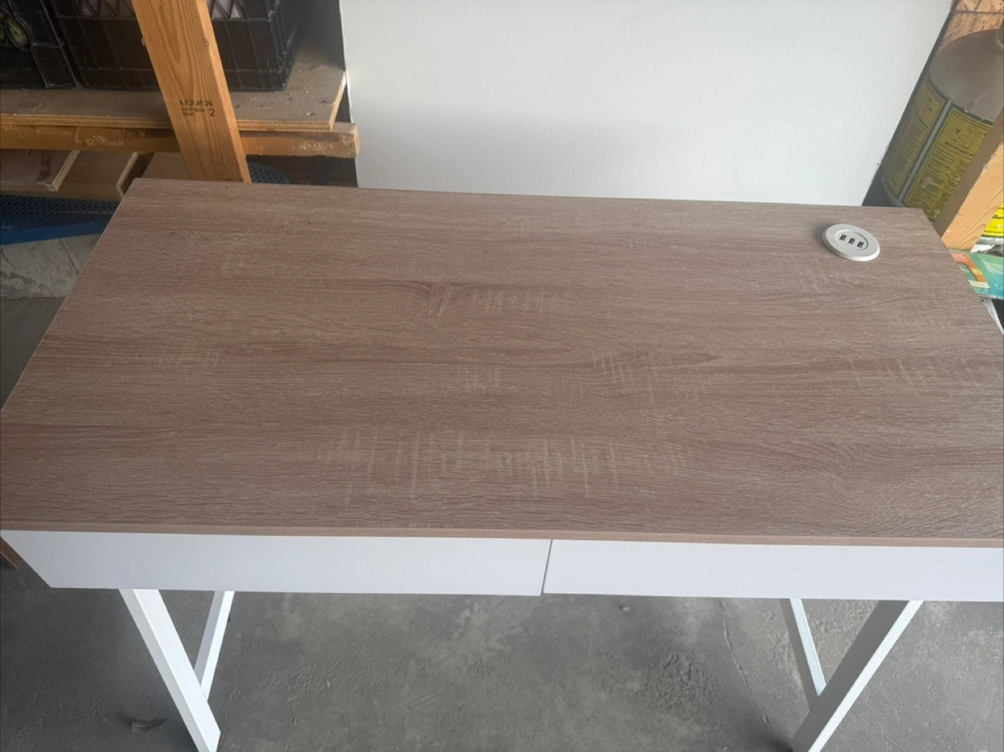 A desk with a sleek, modern design. Features two drawers and a light wood-grain finish. Also features white legs. This desk can be a fantastic space for working in a focused environment.