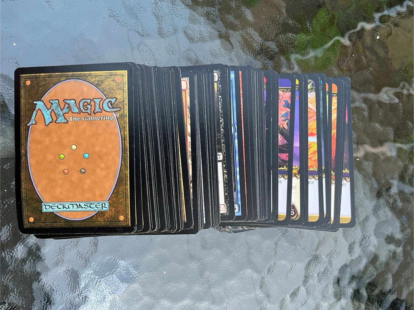 I am selling a collection of Magic the Gathering cards. The cards have coloured illustrations. The back of the deck is brown, with a logo. Playing a card game can offer a sense of tranquility after a long day.