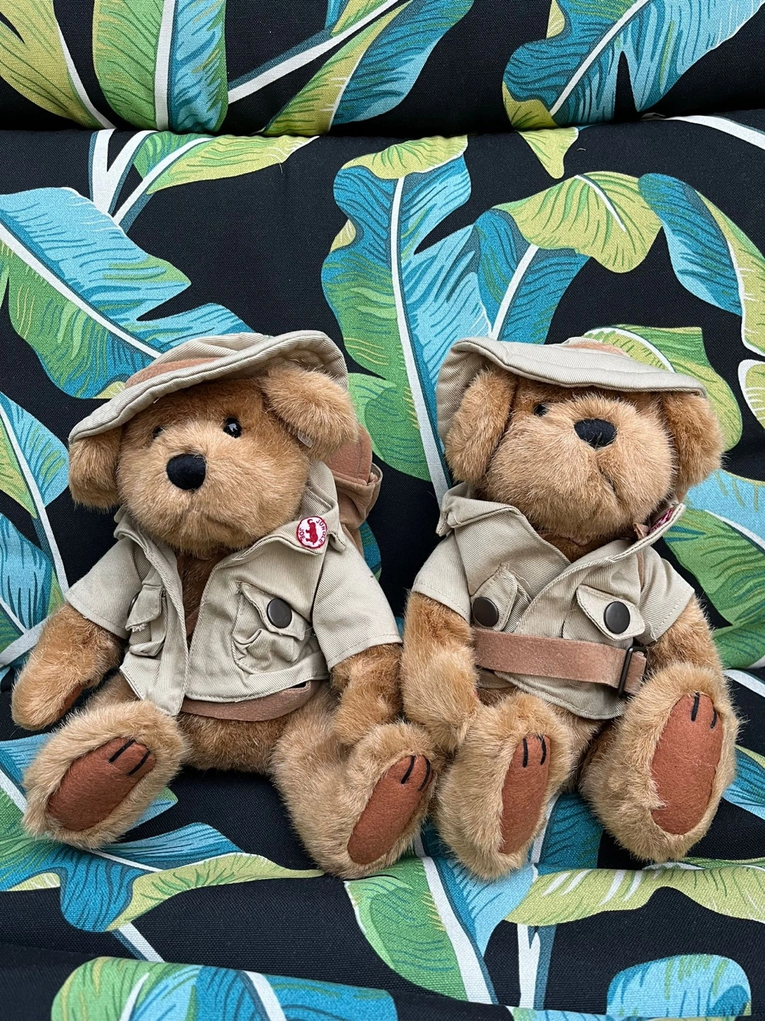 Two charming teddy bears dressed in safari outfits. They have hats, jackets and backpacks. The bears are sitting. These stuffed bears can be a relaxing presence.