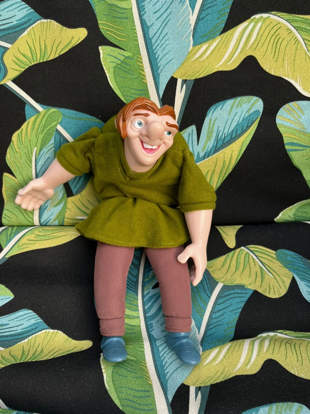 A vintage Quasimodo doll. Features a vinyl head and hands. Dressed in a green tunic, pink pants, and blue shoes. A wonderful item for any Disney fan's collection, I hope you'll enjoy it.
