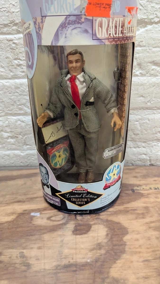 285A George Burns doll inside a box. Featuring a suit with a tie. Also shows an exclusive premiere collector's series. This is a great item to display and enjoy.