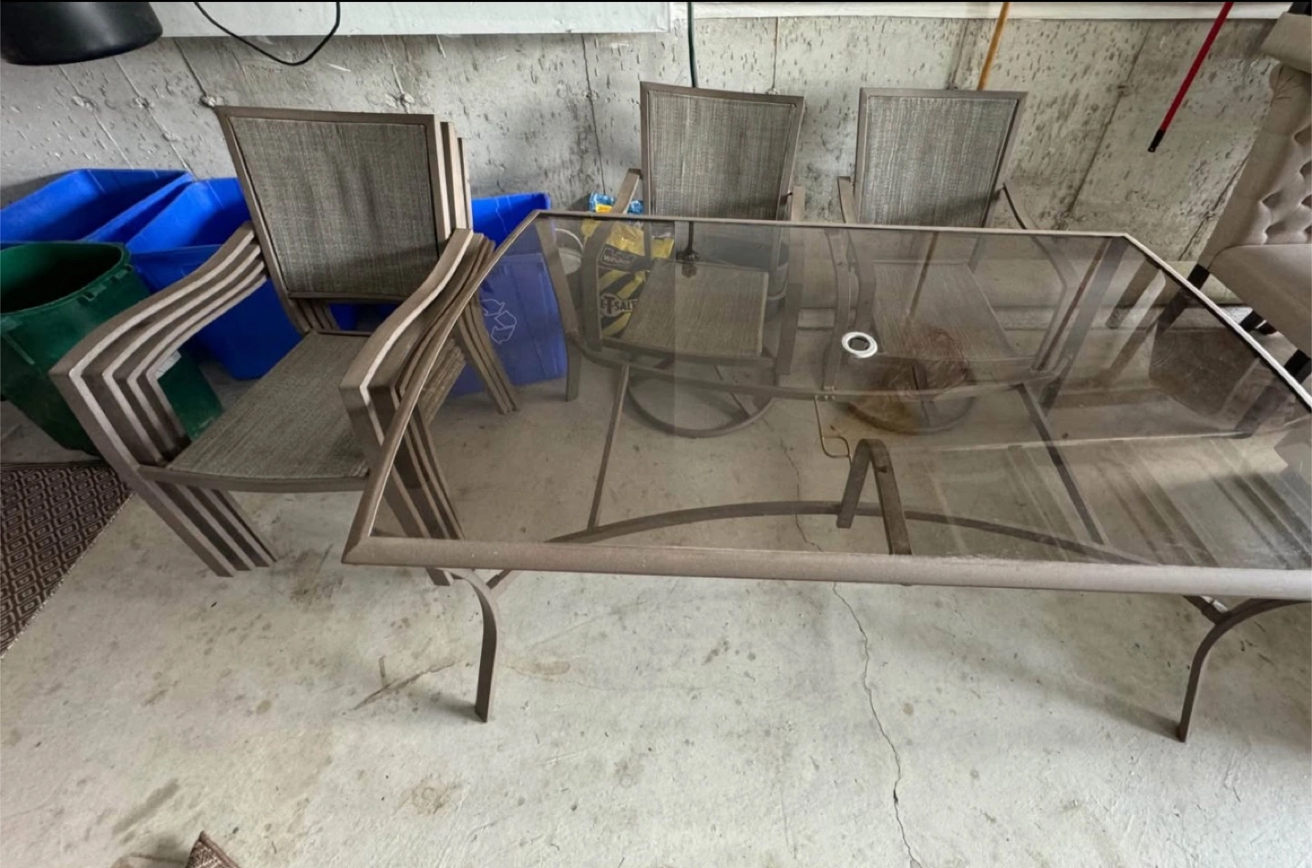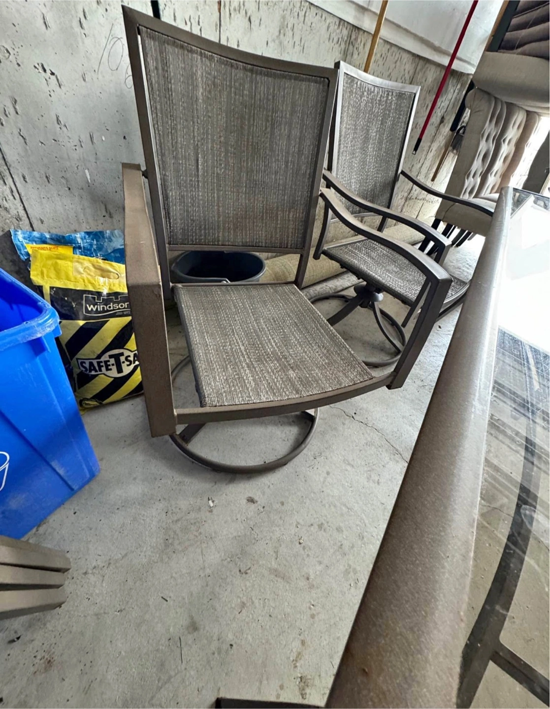 A lovely set, ready for your backyard. Set consists of a glass top table, and chairs. Perfect for a nice brunch, or a relaxing drink outside. 6 chairs, glass table