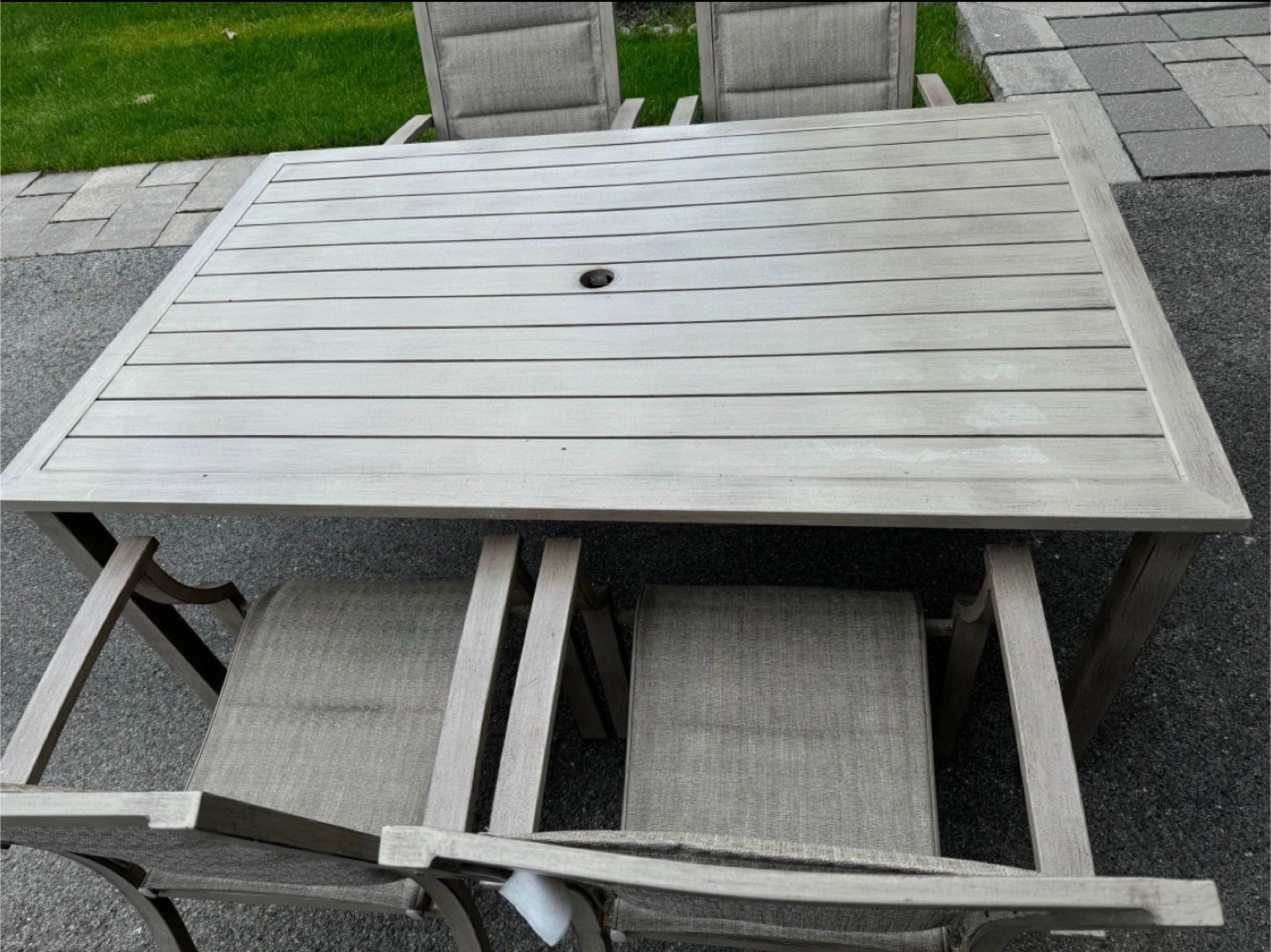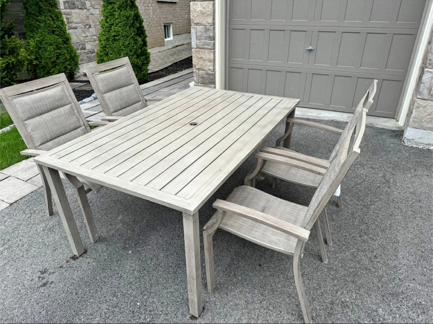 A lovely outdoor dining set with a table and chairs. The table has a hole in the center. Chairs have armrests. Table and 4 chairs are neutral-toned. Perfect for enjoying a nice dinner outdoors. good condition