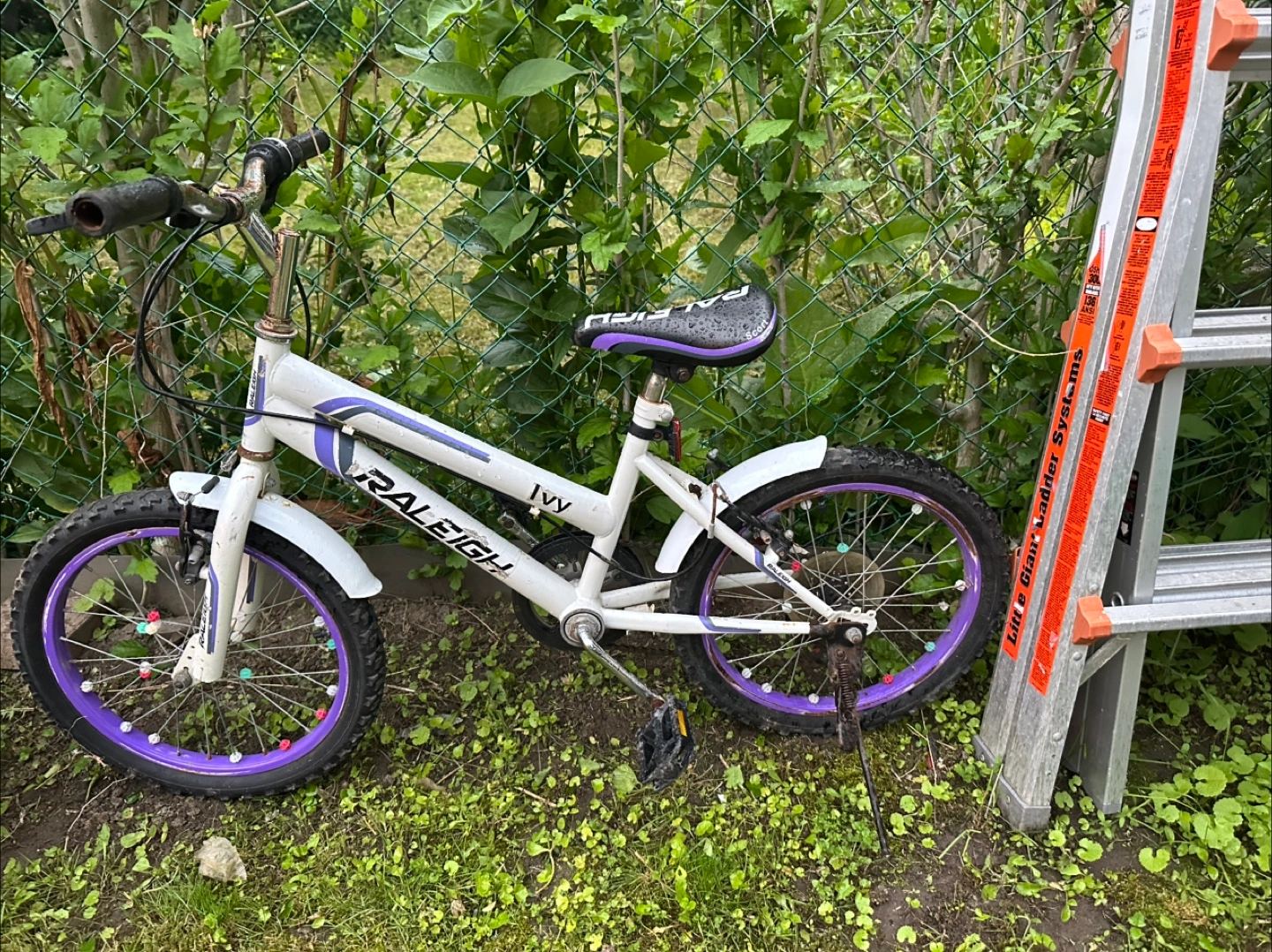 553White frame with purple accents. Features matching purple rims. A great bike for little ones, perfect for exploring the neighbourhood at a relaxed pace. Has a bit of rust on the wheel, but that can be fixed. Selling as is.