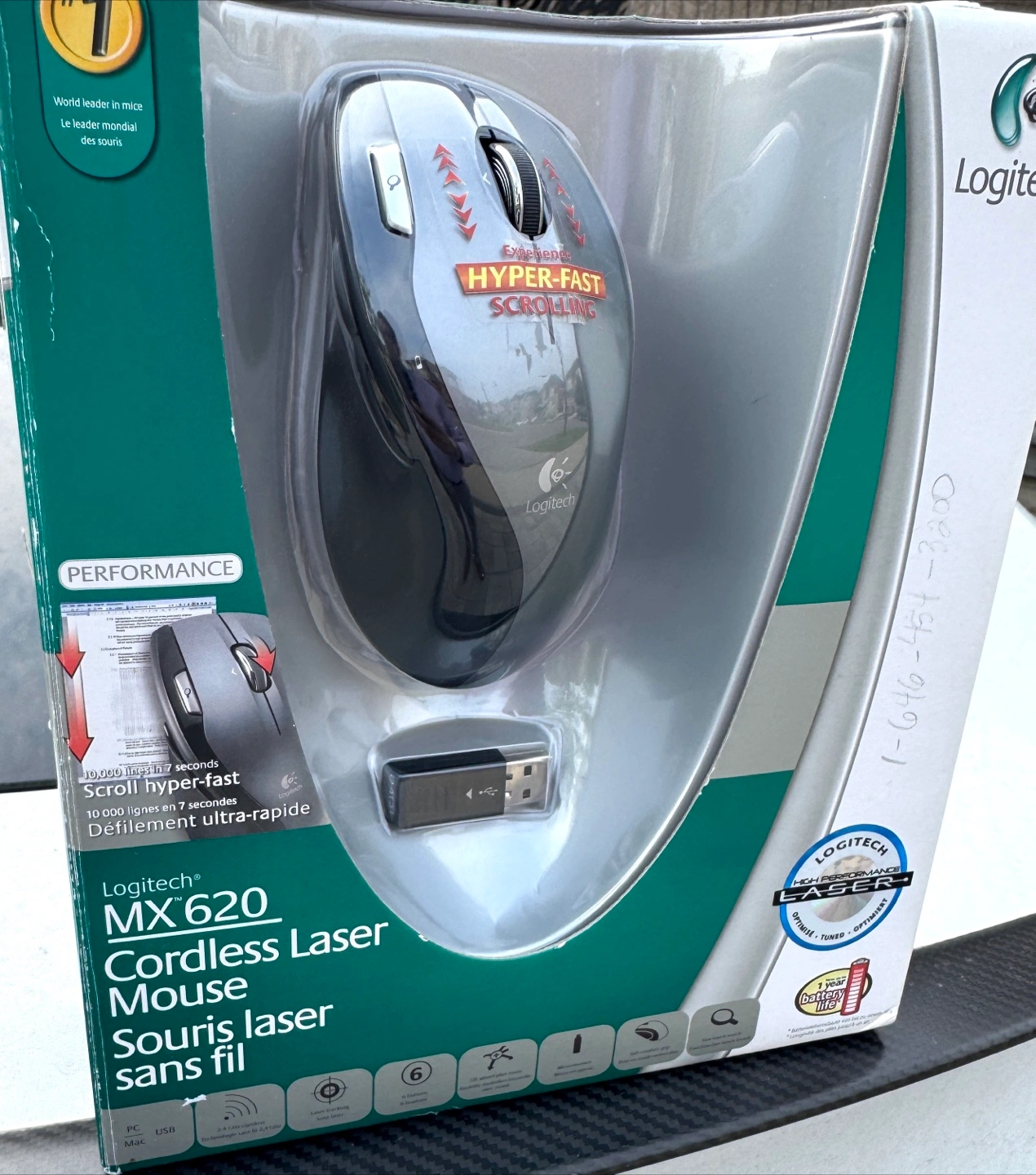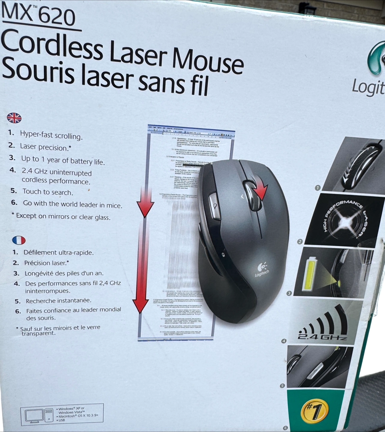 A Logitech MX620 cordless laser mouse. It features hyper-fast scrolling and a laser precision. You can create smooth, controlled movements using this mouse.