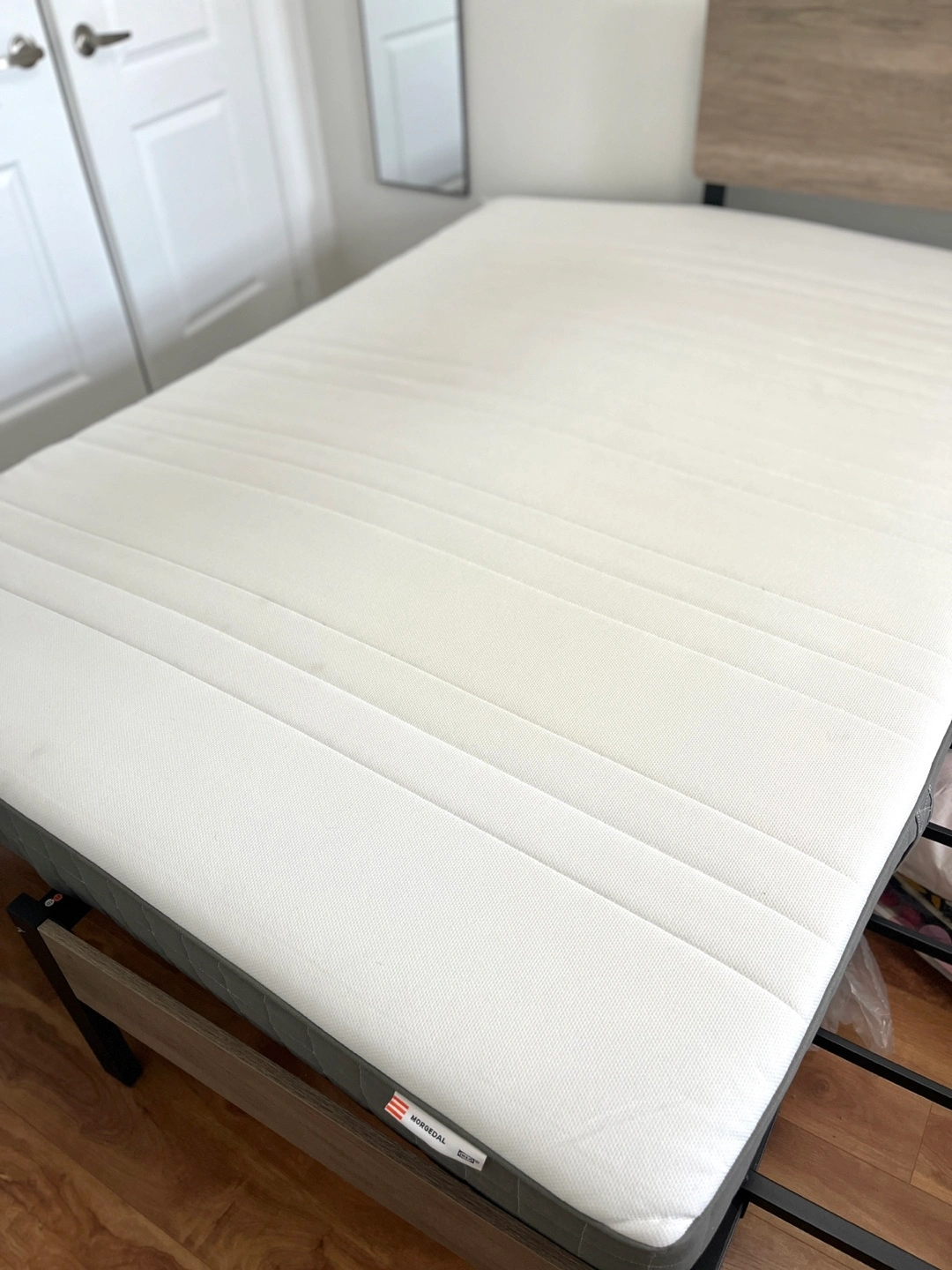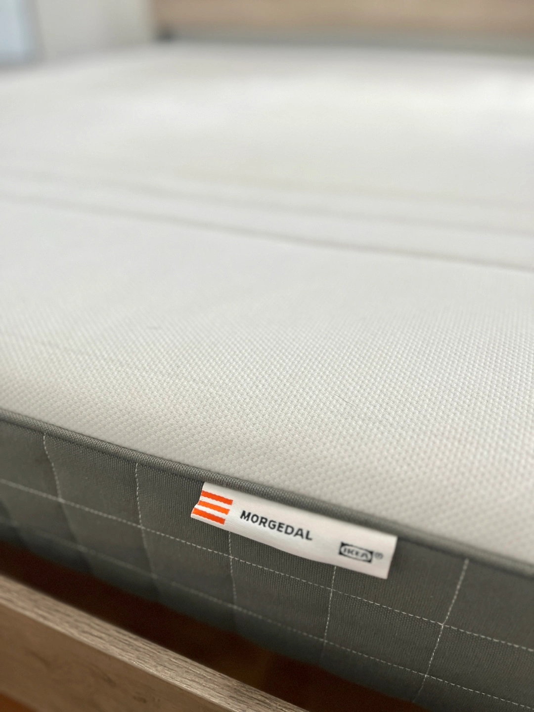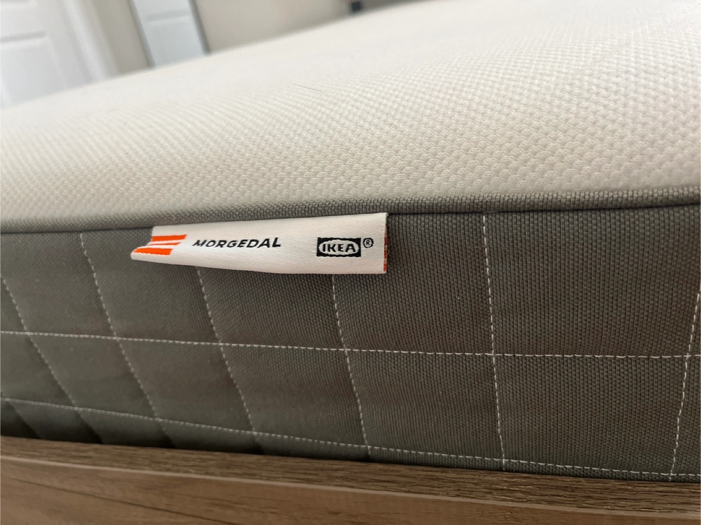 Mattress with a quilted design and a light-coloured top. The border is a darker shade of grey. Makes for a good place to rest your head after a long day.