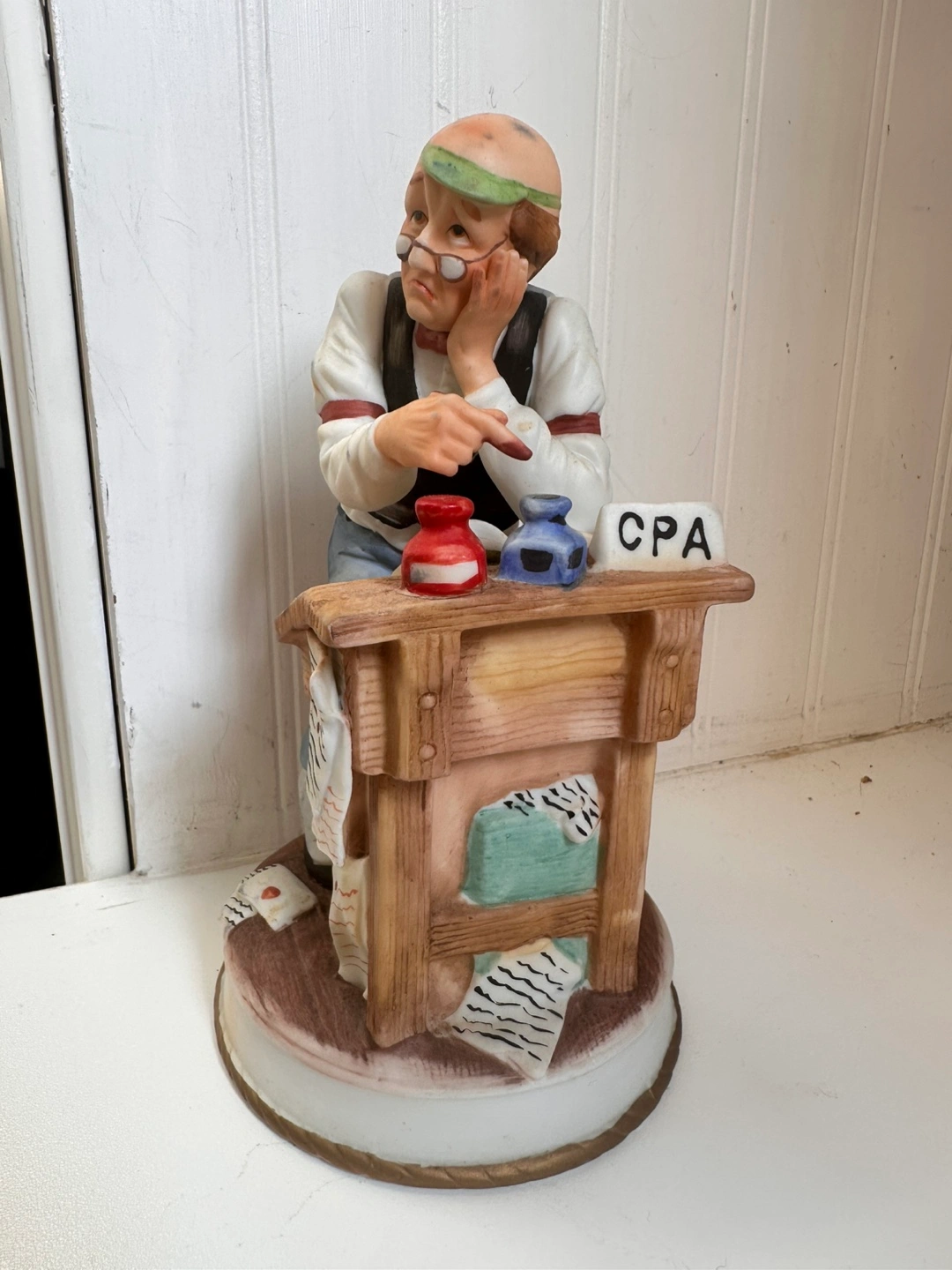 Porcelain CPA Figurine. A porcelain figurine depicts a man with distraught look surrounded by papers with a plaque that reads CPA. Height 7 1/2". Condition excellent.