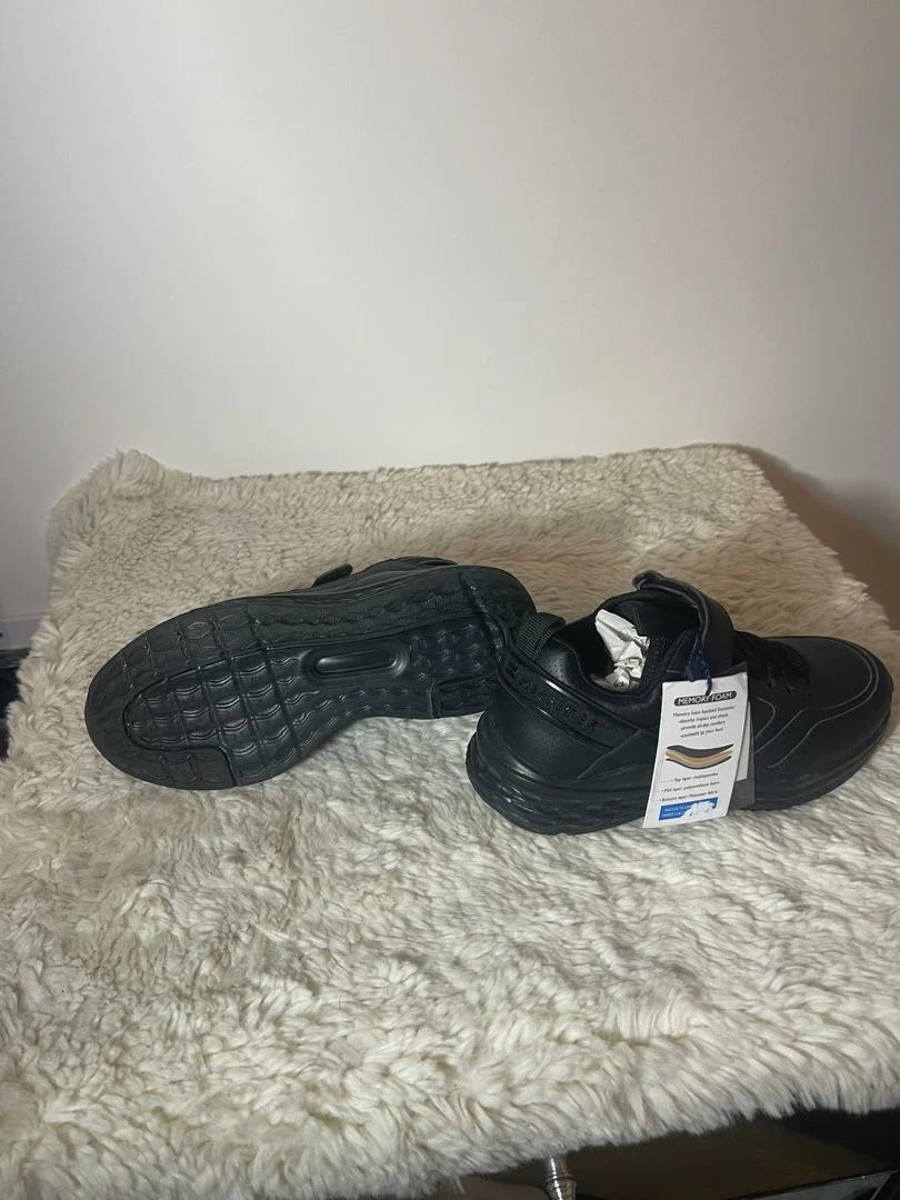 Black sneakers with hook and loop closure. They feature a textured outsole. Ideal for everyday use, these sneakers can help your kid feel calm and collected.