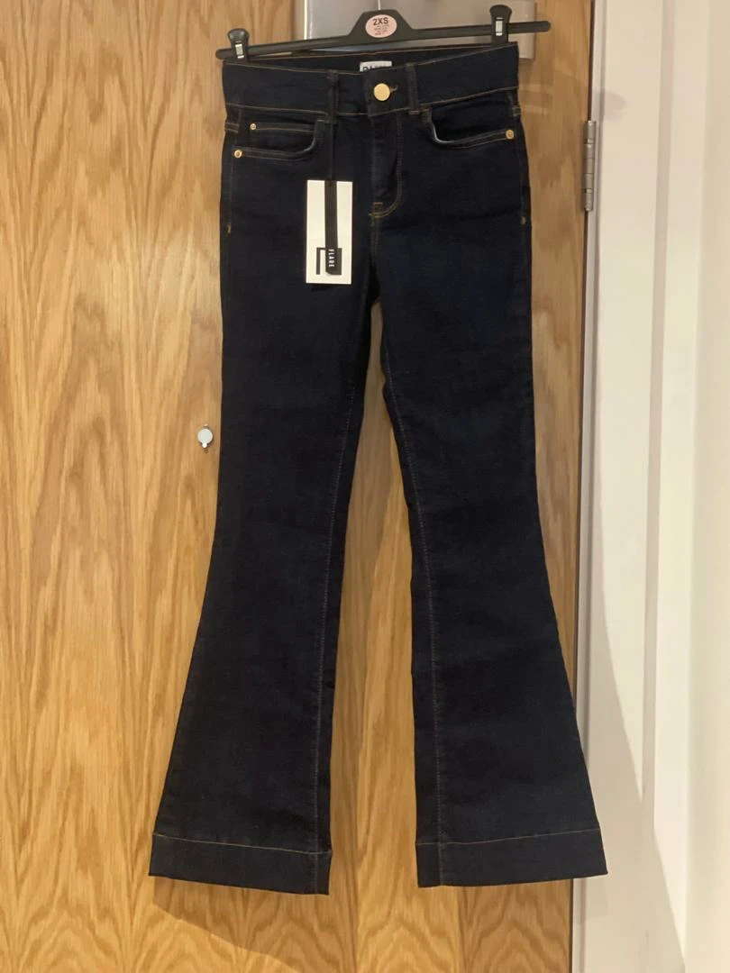 These dark wash jeans feature a high waist and flare silhouette. They are brand new with tags. Perfect for a casual yet chic look.