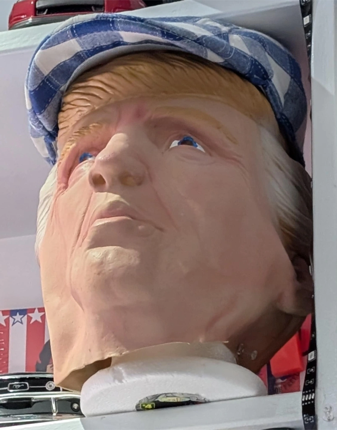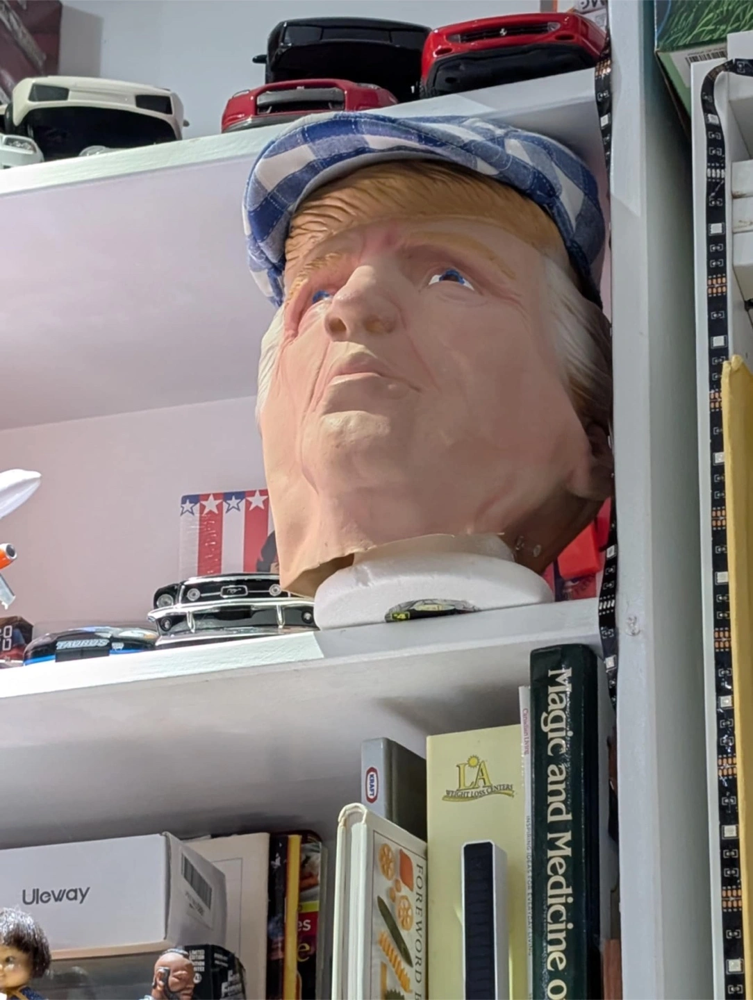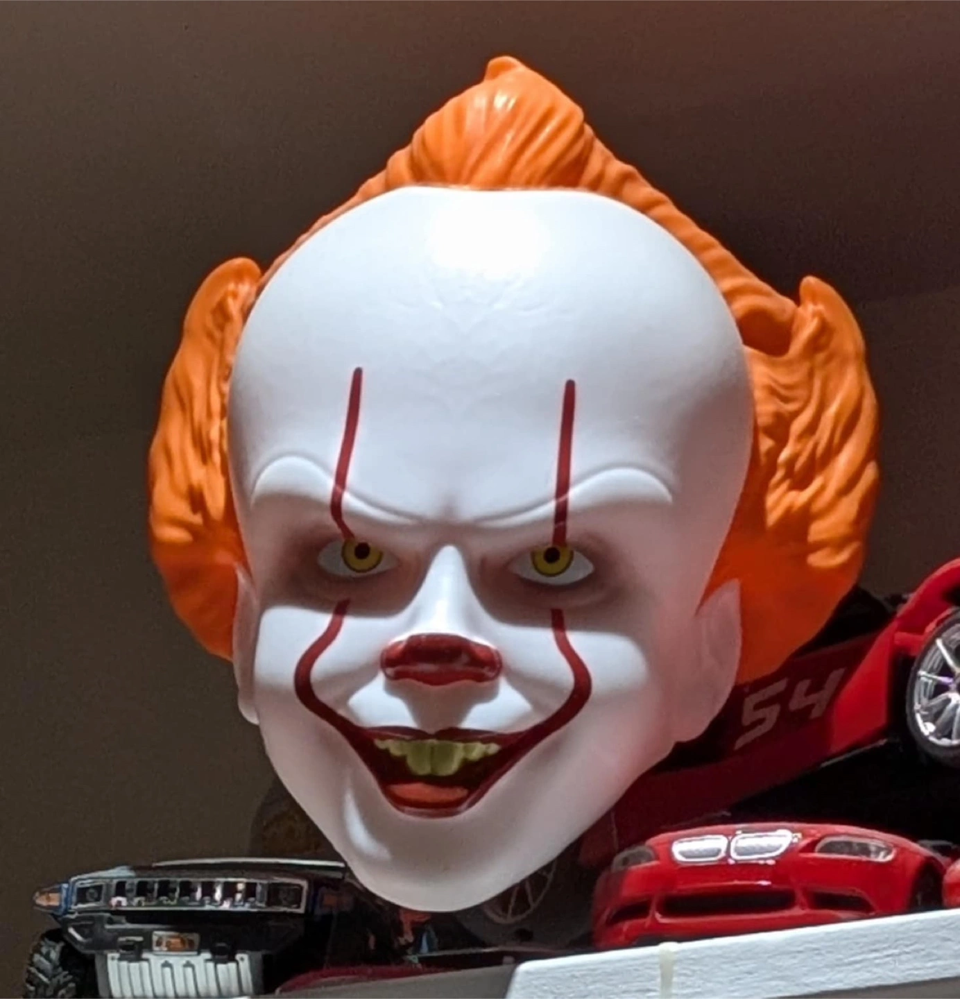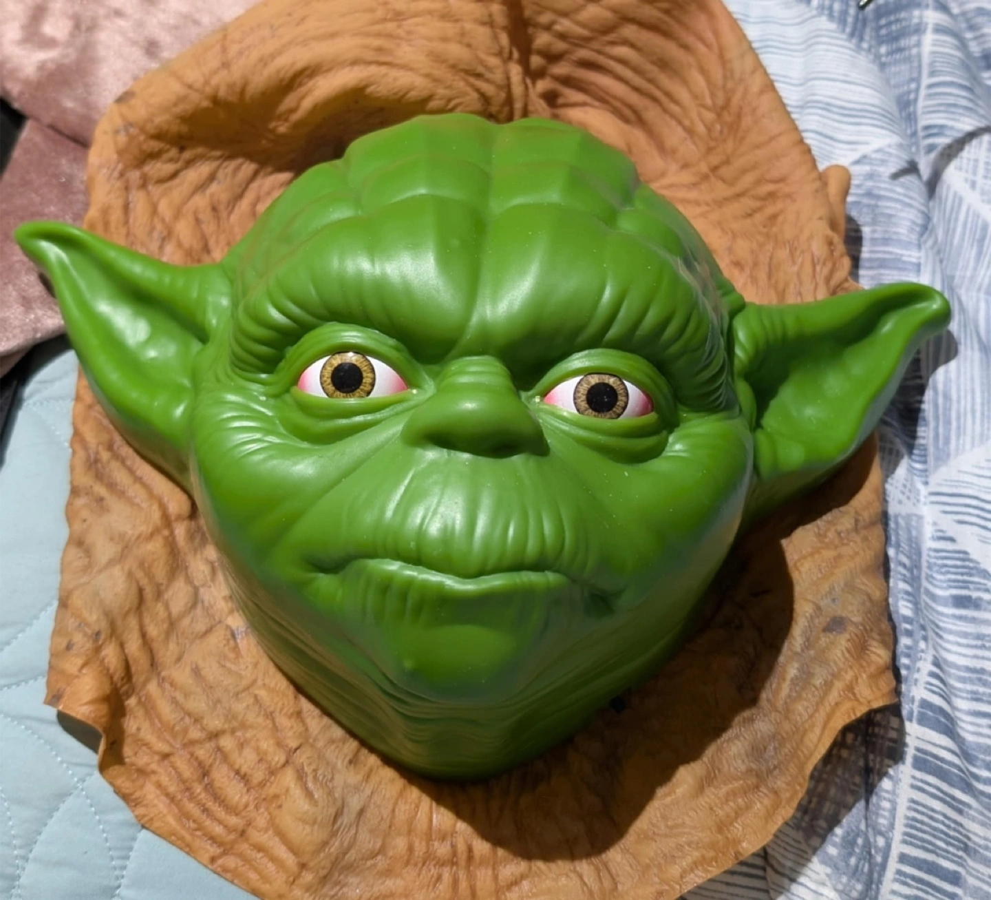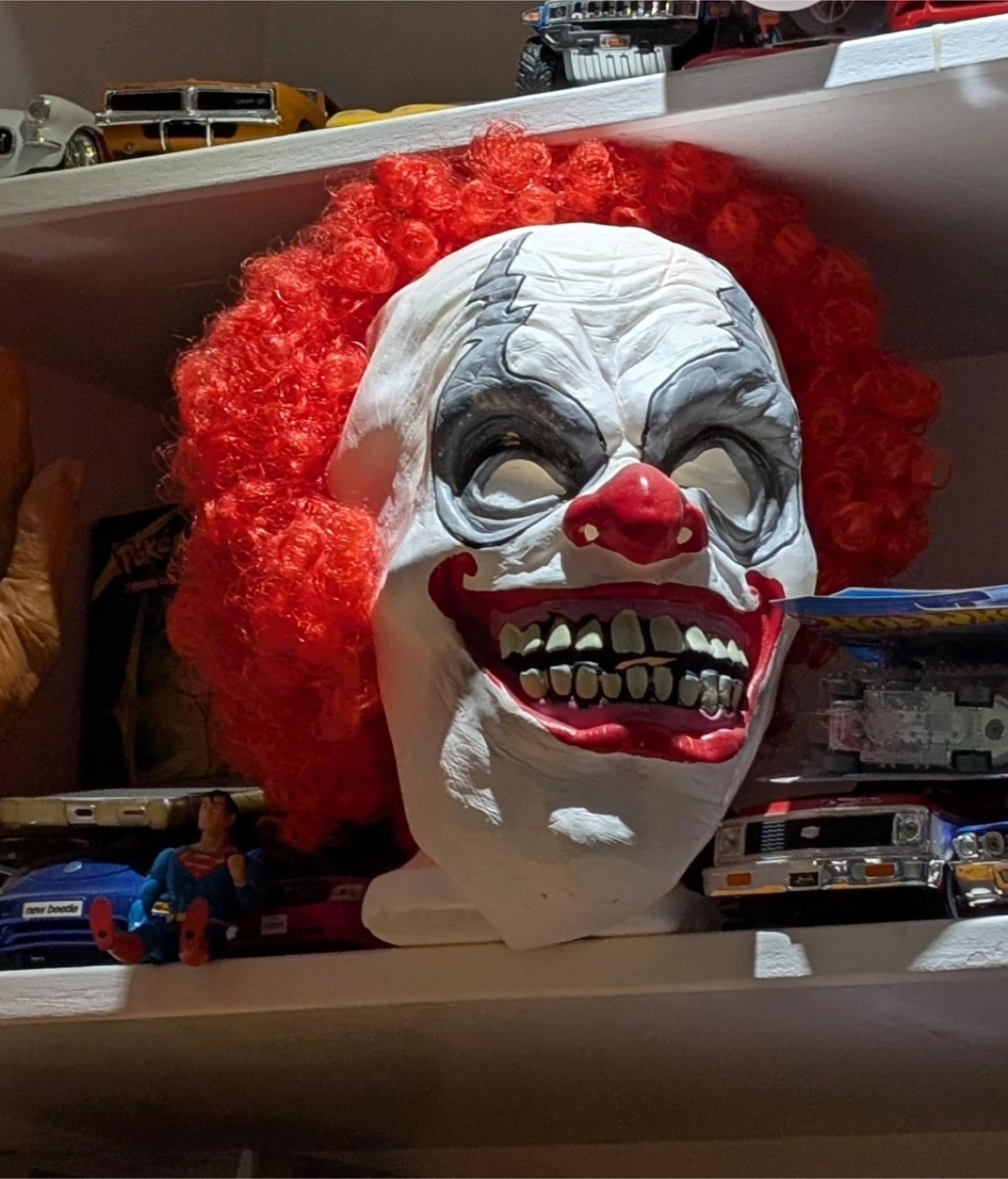 Collection of several masks, with a variety of appearances. A large hand, a wrinkly face, a face with a hat, a green face, and a clown face. Perfect for imaginative play, adding to a costume, or even just as a unique display piece for your home, and a great way to relax, and simply unwind.