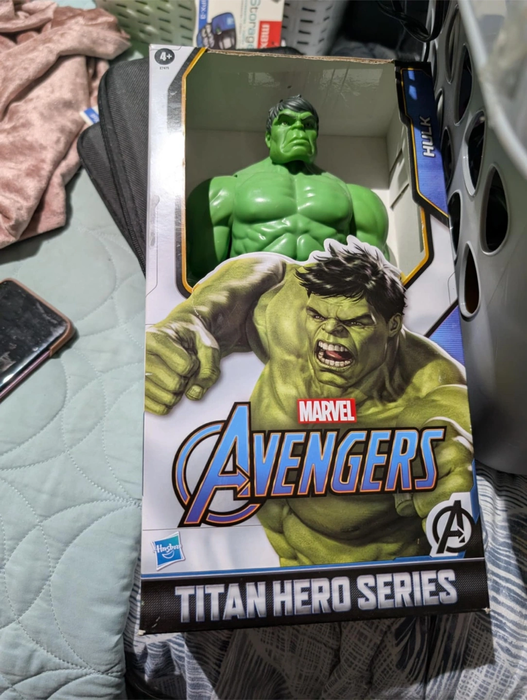 A Hulk action figure in its original packaging. The packaging has the Marvel Avengers logo. This would make a great addition to any collection of comic book characters.