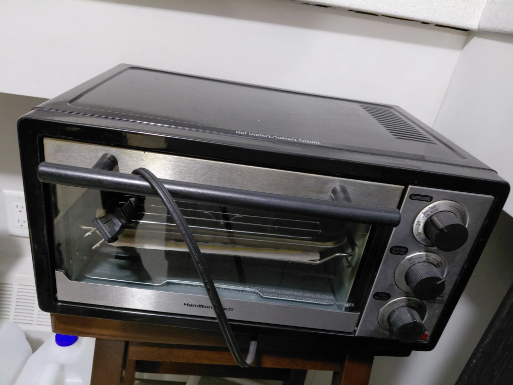 Here is a lovely Hamilton Beach toaster oven. It's black and silver. There are several control knobs. You can make a simple breakfast with it. Good condition. CASH ONLY. NO DELIVERY.