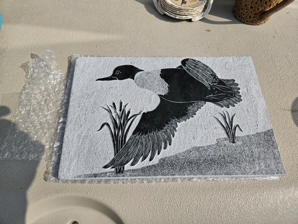 Features a flying duck. Depicts some aquatic plants. Includes a hanging wire. It can become a piece that brings you moments of tranquility.
