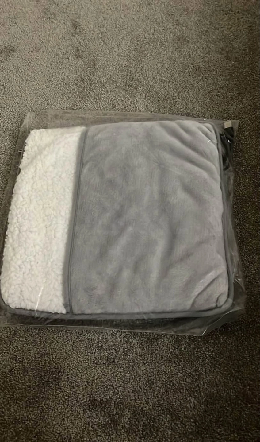A grey and white foot warmer. Made with a fuzzy material. Includes a USB cord. Perfect for adding extra comfort and relaxation during cold winter days. Bring cash only