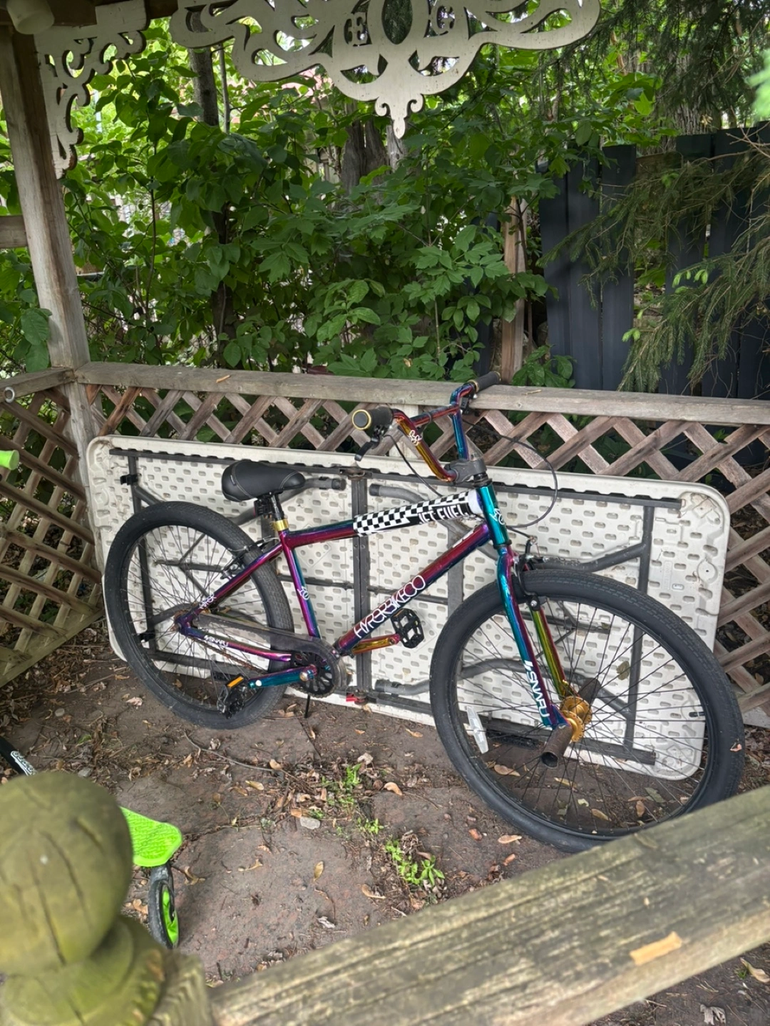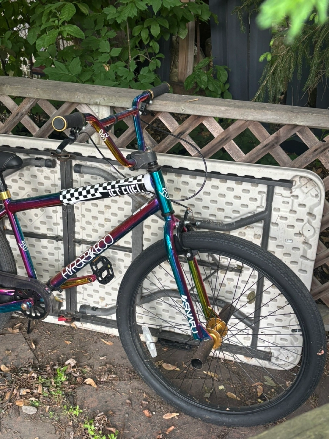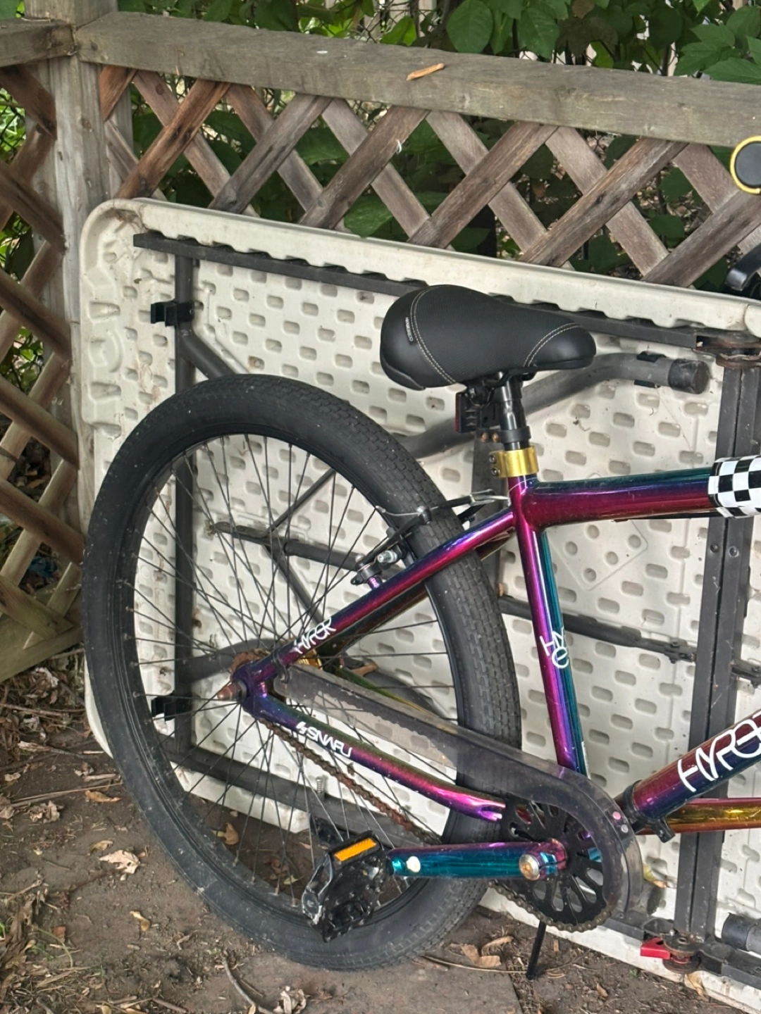 169A colourful Hyperkeego BMX bike. The bike shows a cool colour scheme. It has black tires and pedals. Riding it will bring a sense of peace.