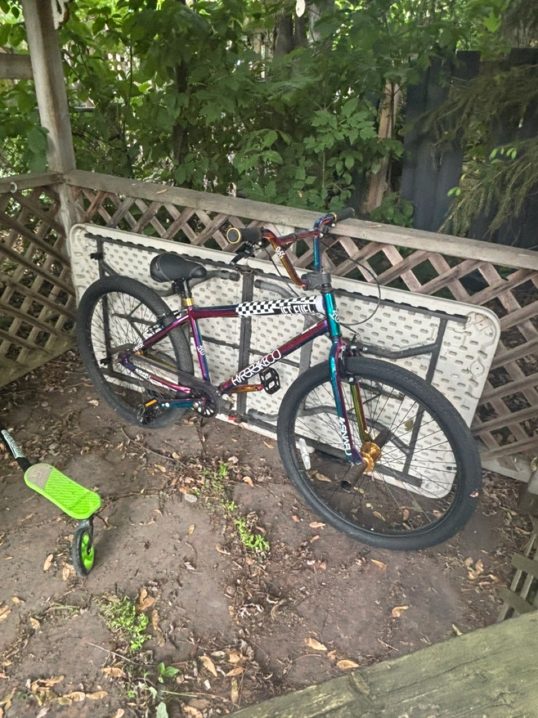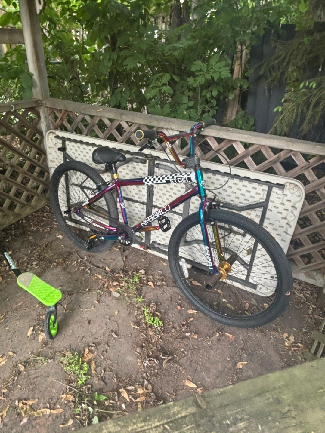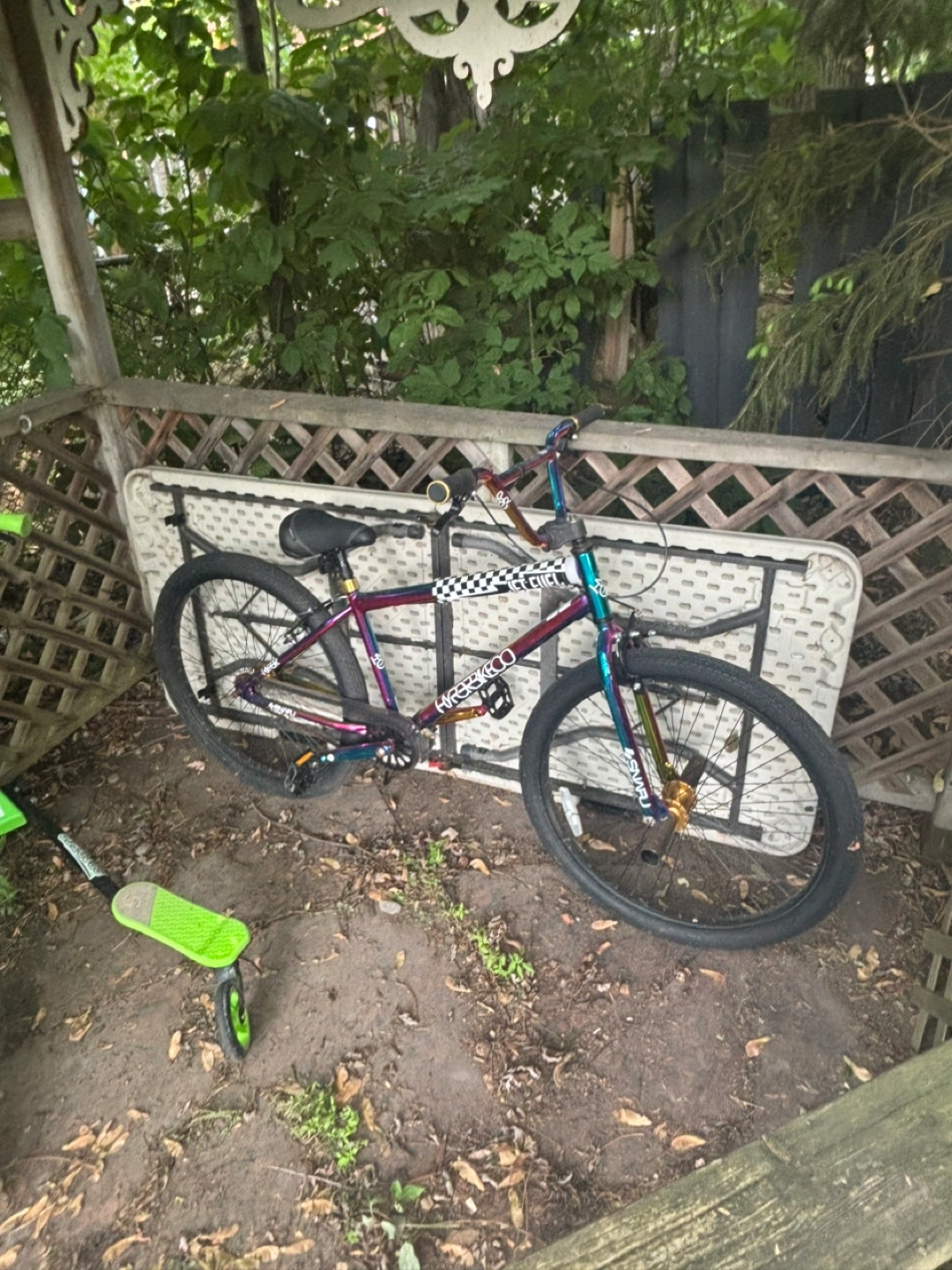 169A colourful Hyperkeego BMX bike. The bike shows a cool colour scheme. It has black tires and pedals. Riding it will bring a sense of peace.